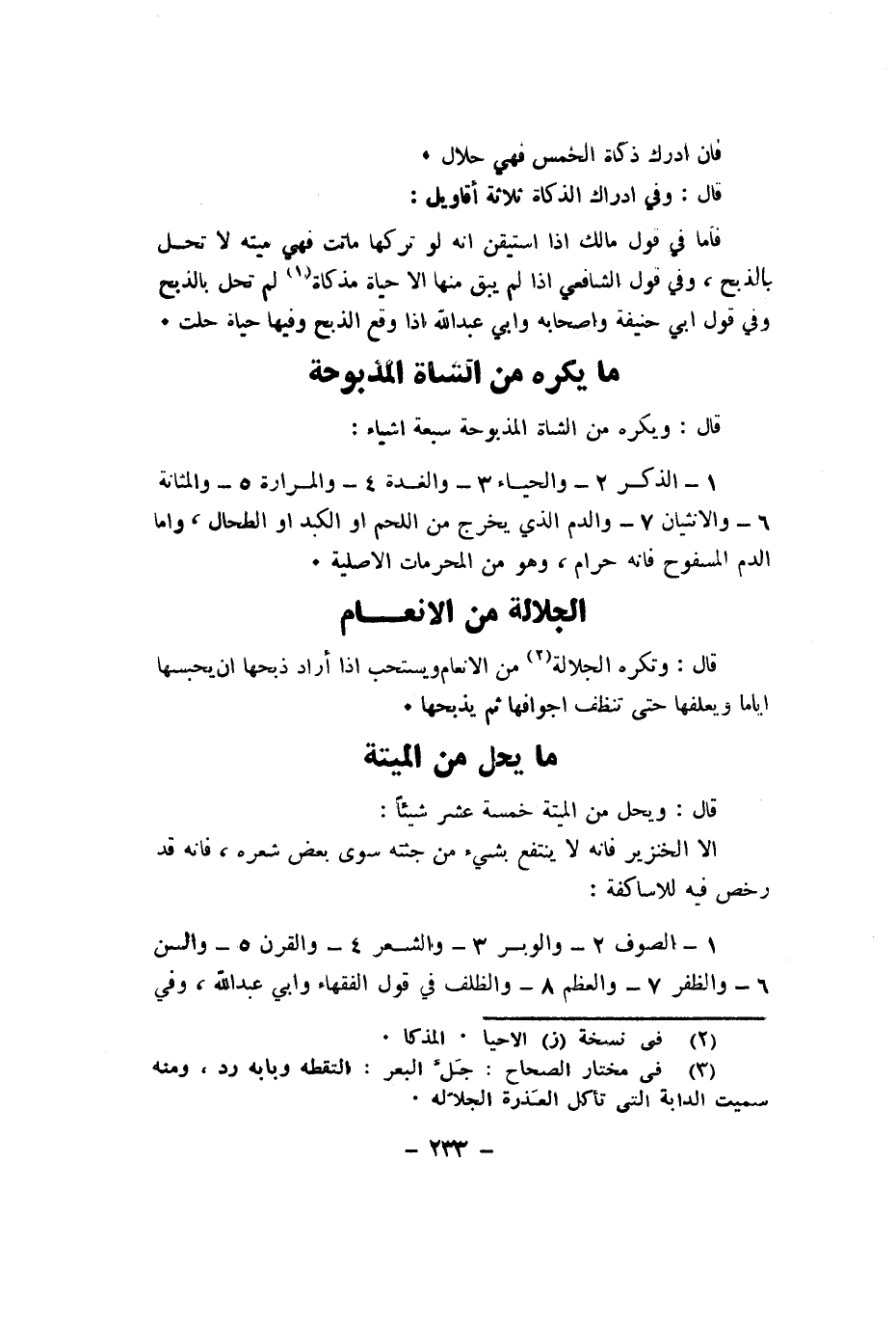 فَأَما فِي قَول مَالك اذا استيقن انه لَو تَركهَا مَاتَت فَهِيَ ميته لَا تحل بِالذبْحِ وَفِي قَول الشَّافِعِي اذا لم يبْق مِنْهَا الا حَيَاة مذكاة لم تحل بِالذبْحِ وَفِي قَول ابي حنيفَة واصحابه وابي عبد الله اذا وَقع الذّبْح وفيهَا حَيَاة حلت