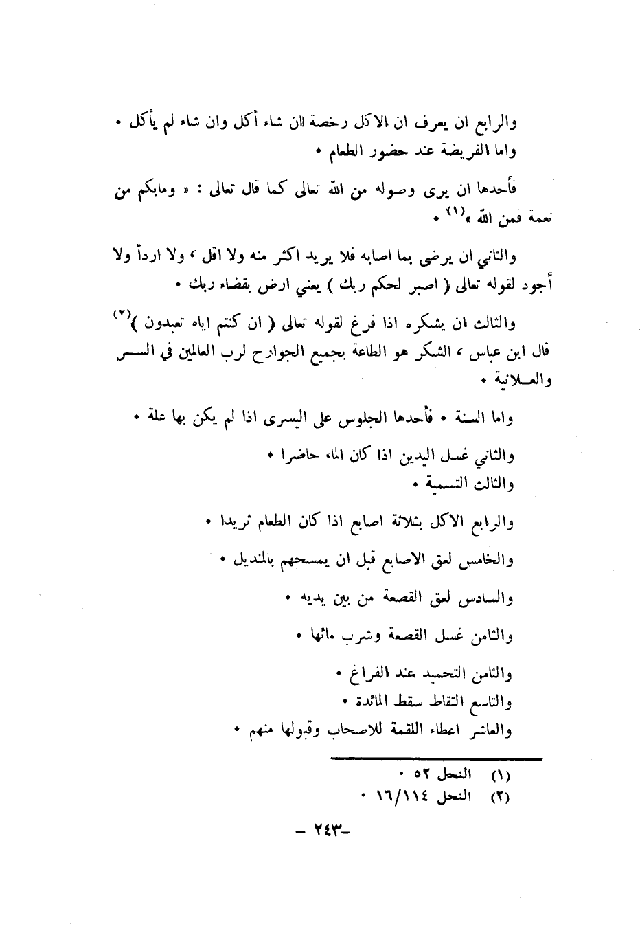 وَالثَّالِث ان يشكره اذا فرغ لقَوْله تَعَالَى {إِن كُنْتُم إِيَّاه تَعْبدُونَ} قَالَ ابْن عَبَّاس الشُّكْر هُوَ الطَّاعَة بِجَمِيعِ الْجَوَارِح لرب الْعَالمين فِي السِّرّ وَالْعَلَانِيَة