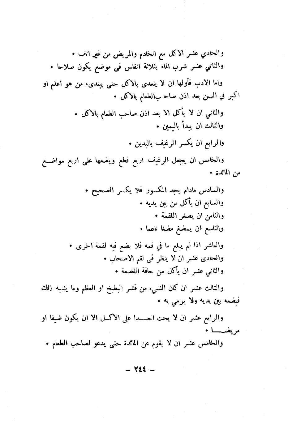 واما الْأَدَب فأولها ان لَا يتَعَدَّى بالاكل حَتَّى يَبْتَدِئ من هُوَ اعْلَم اَوْ اكبر فِي السن بعد اذن صَاحب الطَّعَام بالاكل