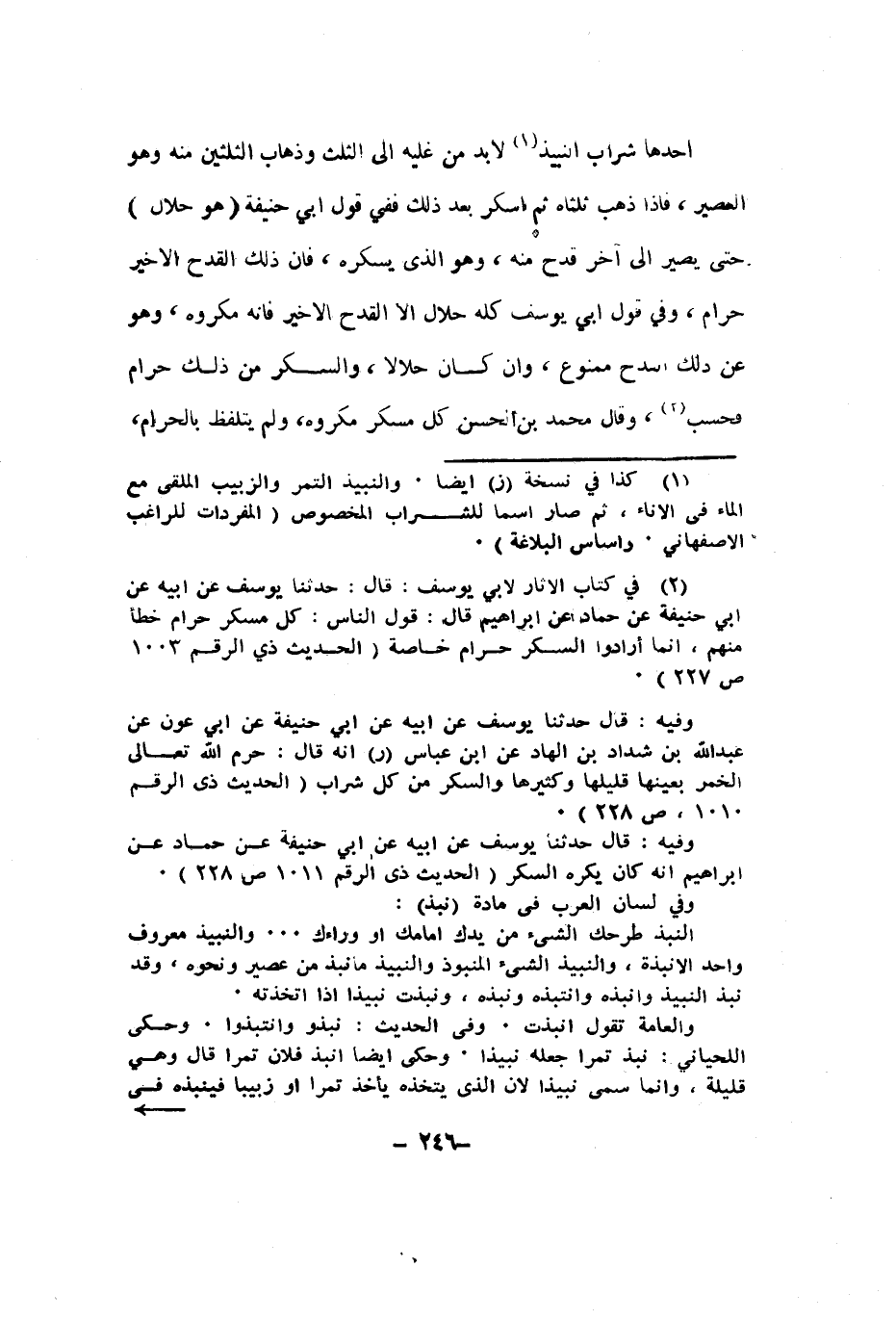 احدها شراب النَّبِيذ لَا بُد من غليه الى الثُّلُث وَذَهَاب الثُّلثَيْنِ مِنْهُ وَهُوَ الْعصير فاذا ذهب ثُلُثَاهُ ثمَّ اسكر بعد ذَلِك فَفِي قَول ابي حنيفَة هُوَ حَلَال حَتَّى يصير الى آخر قدح مِنْهُ وَهُوَ الَّذِي يسكره فان ذَلِك الْقدح الاخير حرَام وَفِي قَول ابي يُوسُف كُله حَلَال الا الْقدح الاخير فانه مَكْرُوه وَهُوَ على ذَلِك الْقدح مَمْنُوع وان كَانَ حَلَالا وَالسكر من ذَلِك حرَام فَحسب وَقَالَ مُحَمَّد بن الْحسن كل مُسكر مَكْرُوه وَلم يتَلَفَّظ بالحرام