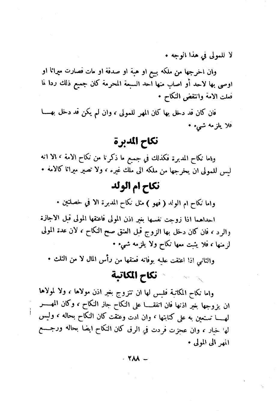 واما نِكَاح الْمُدبرَة فَكَذَلِك فِي جَمِيع مَا ذكرنَا من نِكَاح الامة الا انه لَيْسَ للْمولى ان يُخرجهَا من ملكه الى ملك غَيره وَلَا تصير مِيرَاثا كالامة