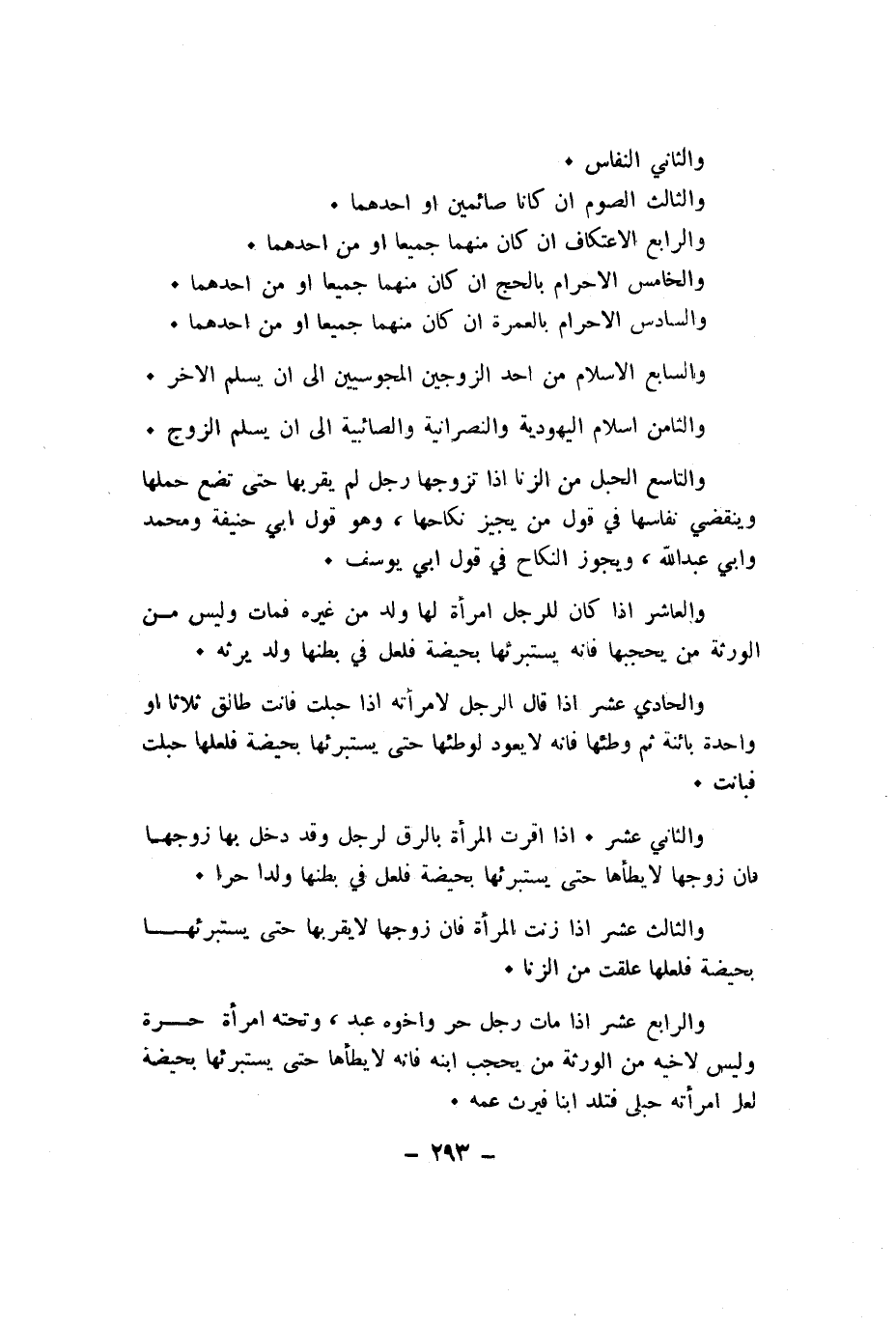 وَالرَّابِع عشر اذا مَاتَ رجل حر واخوه عبد وَتَحْته امْرَأَة حرَّة وَلَيْسَ لاخيه من الْوَرَثَة من يحجب ابْنه فانه لَا يَطَأهَا حَتَّى يَسْتَبْرِئهَا بِحَيْضَة لَعَلَّ امْرَأَته حُبْلَى فتلد ابْنا فيرث عَمه