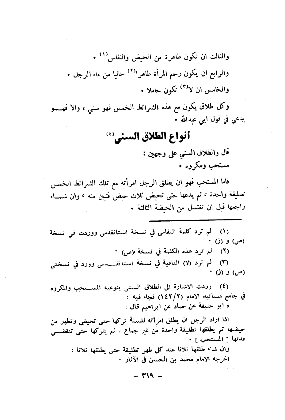وكل طَلَاق يكون مَعَ هَذِه الشَّرَائِط الْخمس فَهُوَ سني والا فَهُوَ بدعي فِي قَول ابي عبد الله