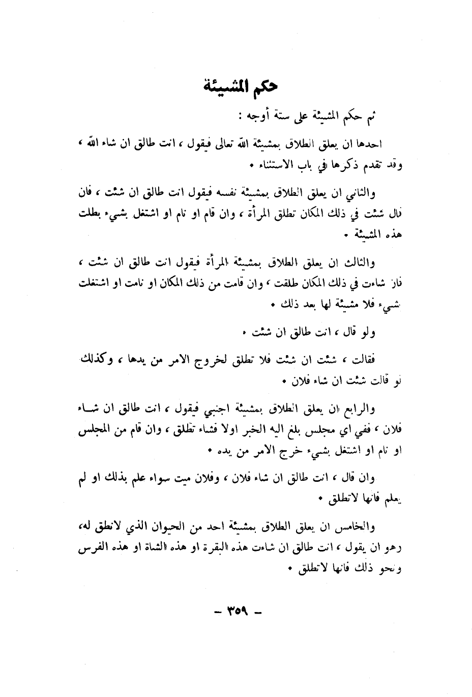وَالْخَامِس ان يعلق الطَّلَاق بِمَشِيئَة اُحْدُ من الْحَيَوَان الَّذِي لَا نطق لَهُ وَهُوَ ان يَقُول انت طَالِق ان شَاءَت هَذِه الْبَقَرَة اَوْ هَذِه الشَّاة اَوْ هَذِه الْفرس وَنَحْو ذَلِك فانها لَا تطلق