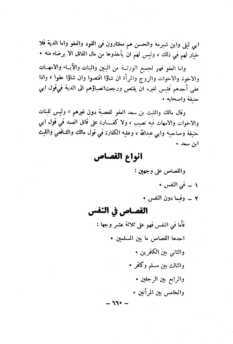واما الْعَفو لجَمِيع الْوَرَثَة من الْبَنِينَ وَالْبَنَات والآباء والامهات والاخوة والاخوات وَالزَّوْج وَالْمَرْأَة ان شاؤا اقتصوا وان شاؤا عفوا واذا عفى أحدهم فَلَيْسَ لغيره ان يقْتَصّ وَرجعت انصباؤهم الى الدِّيَة فِي قَول ابي حنيفَة واصحابه وَقَالَ مَالك وَاللَّيْث بن سعد الْعَفو للْعصبَةِ دون غَيرهم وَلَيْسَ للبنات والاخوات والامهات فِيهِ نصيب وَلَا كَفَّارَة على قَاتل الْعمد فِي قَول ابي حنيفَة وصاحبيه وابي عبد الله وَعَلِيهِ الْكَفَّارَة فِي قَول مَالك وَالشَّافِعِيّ وَاللَّيْث ابْن سعد