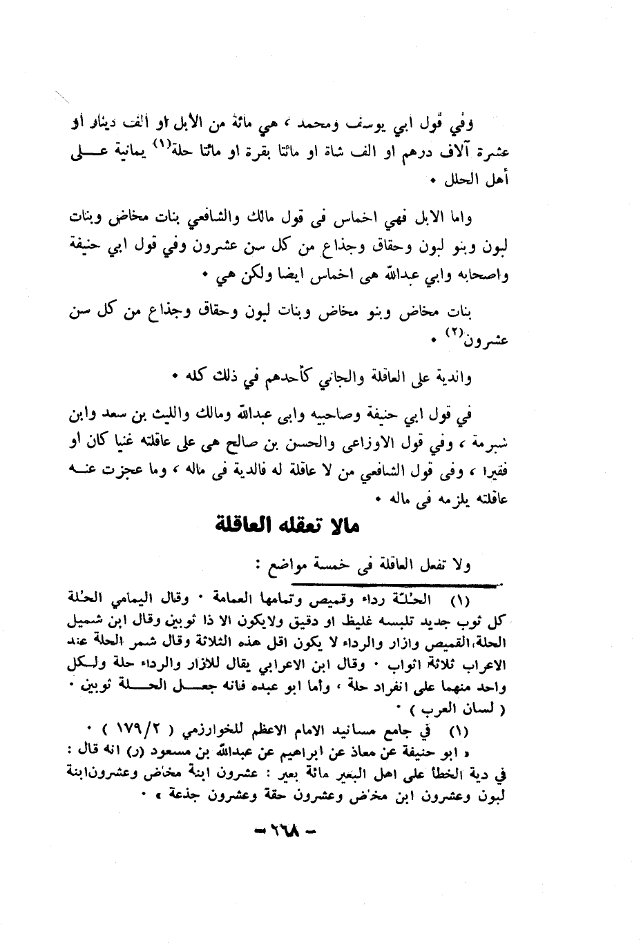 واما الابل فَهِيَ اخماس فى قَول مَالك وَالشَّافِعِيّ بَنَات مَخَاض وَبَنَات لبون وبنمو لبون وحقاق وجذاع من كل سنّ عشرُون وَفِي قَول ابي حنيفَة واصحابه وابي عبد الله هِيَ اخماس ايضا وَلَكِن هِيَ ايضا وَلَكِن هِيَ