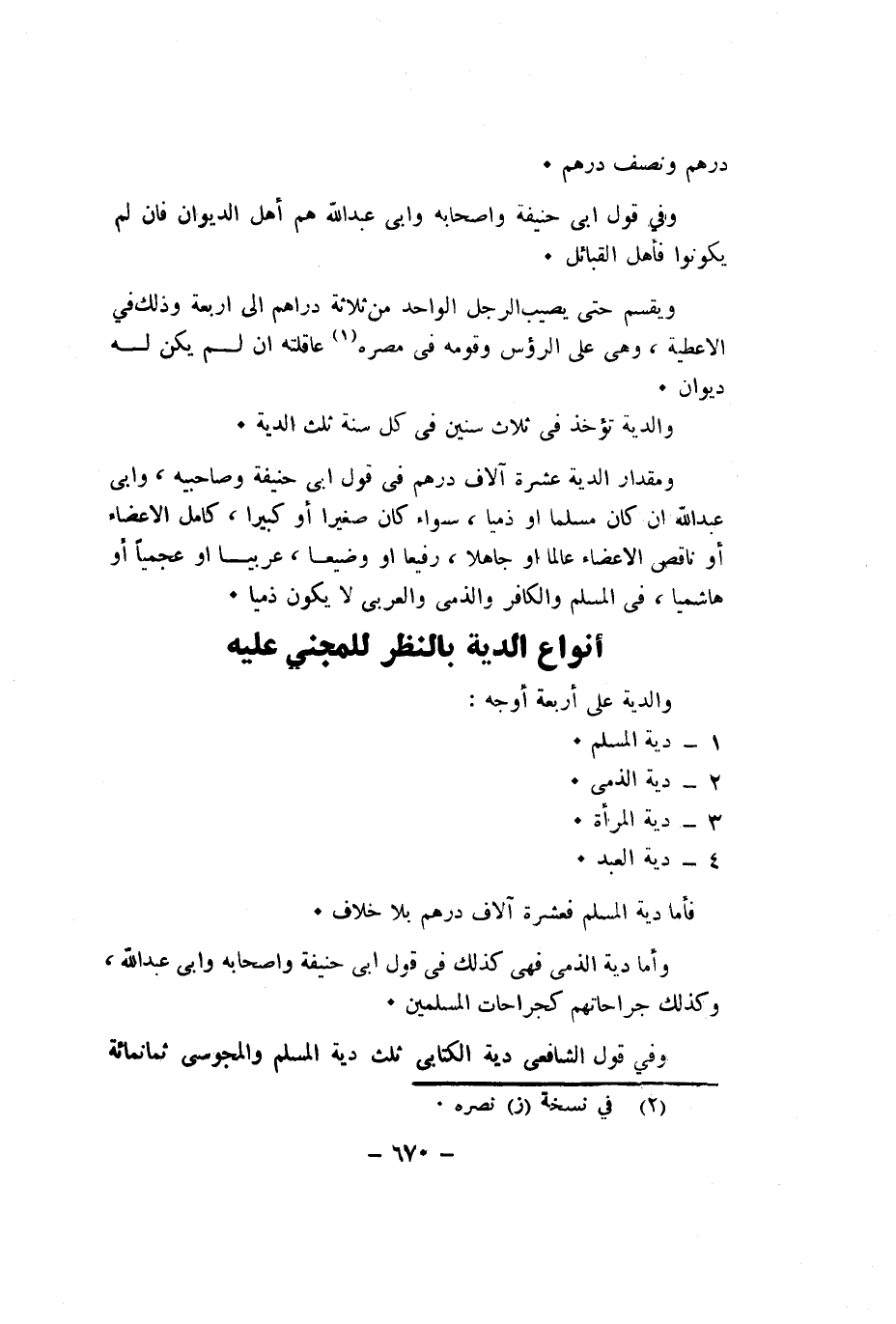 وَمِقْدَار الدِّيَة عشرَة آلَاف دِرْهَم فِي قَول ابي حنيفَة وصاحبيه وابى عبد الله ان كَانَ مُسلما اَوْ ذِمِّيا سَوَاء كَانَ صَغِيرا أَو كَبِيرا كَامِل الاعضاء أَو نَاقص الاعضاء عَالما اَوْ جَاهِلا رفيعا اَوْ وضيعا عَرَبيا اَوْ عجميا أَو هاشميا فى الْمُسلم وَالْكَافِر والذمى والعربى لايكون ذِمِّيا