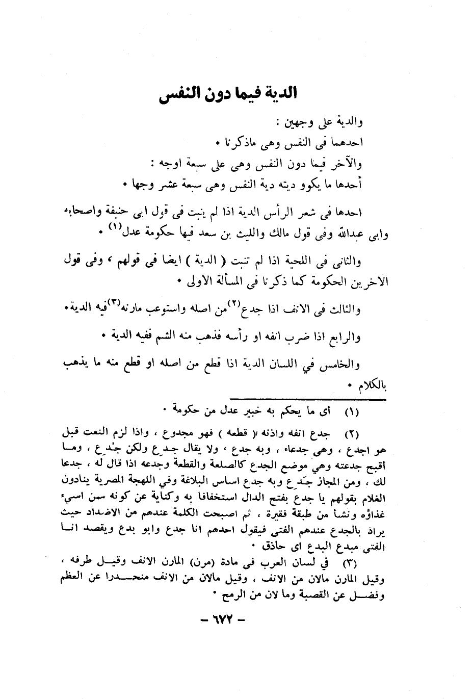 أَحدهَا مَا يكون دِيَته دِيَة النَّفس وهى سَبْعَة عشر وَجها احدهما فِي شعر الرَّأْس الدِّيَة اذا لم ينْبت فِي قَول أبي حنيفَة وَأَصْحَابه وَأبي عبد الله وَفِي قَول مَالك وَاللَّيْث بن سعد فِيهَا حُكُومَة عدل
