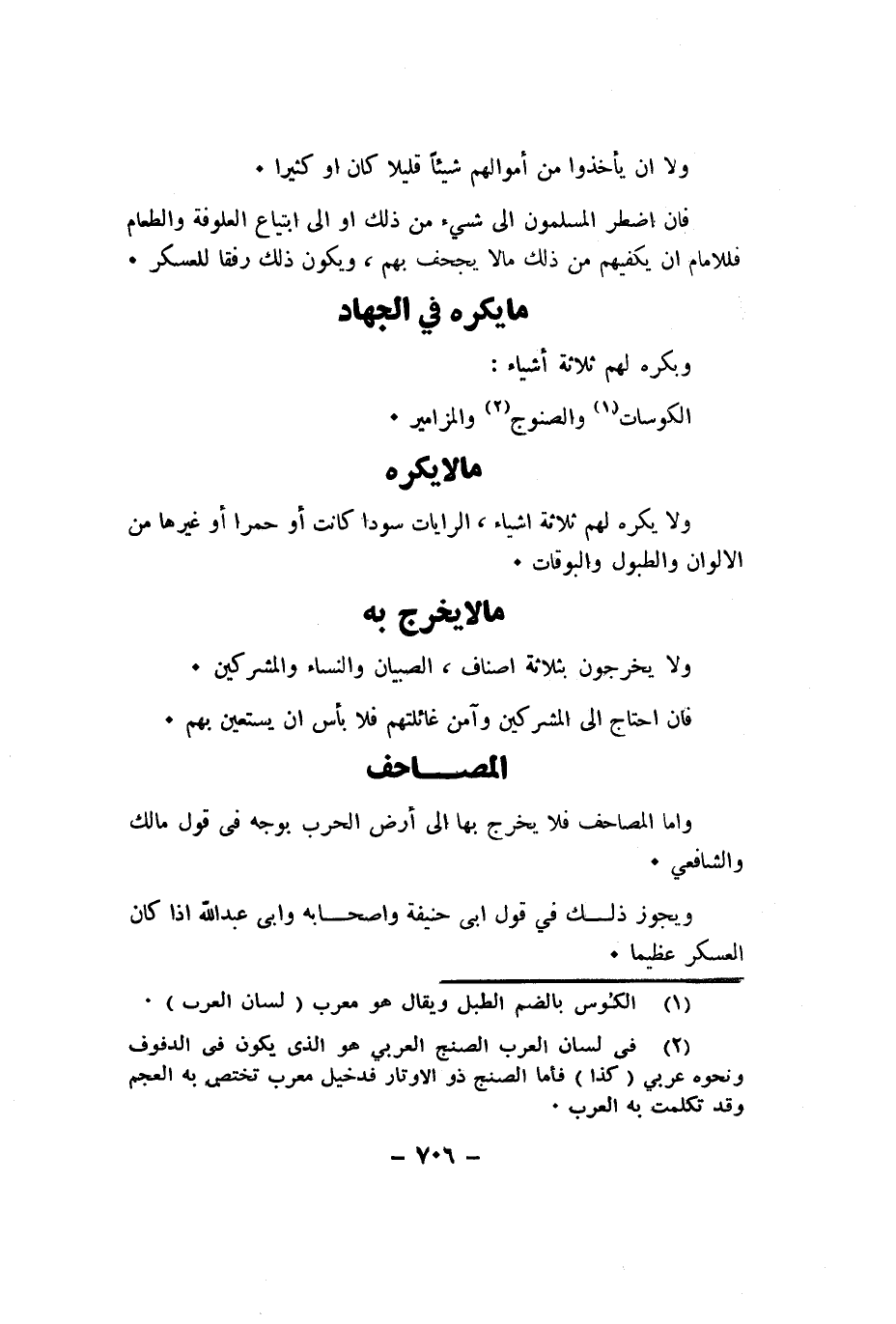 واما الْمَصَاحِف فَلَا يخرج بهَا الى ارْض الْحَرْب بِوَجْه فِي قَول مَالك وَالشَّافِعِيّ