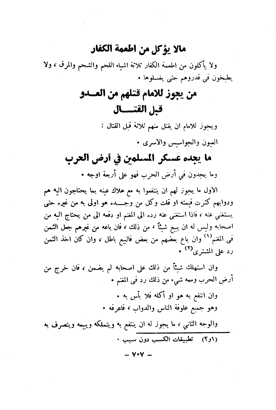 الاول مَا يجوز لَهُم ان ينتفعوا بِهِ مَعَ هَلَاك عينه بِمَا يَحْتَاجُونَ اليه هم ودوابهم كثرت قِيمَته اَوْ قلت وكل من وجده هُوَ اولى بِهِ من غَيره حَتَّى يَسْتَغْنِي عَنهُ فاذا اسْتغنى عَنهُ رده الى الْمغنم اَوْ دَفعه الى من يحْتَاج اليه من اصحابه وَلَيْسَ لَهُ ان يَبِيع شَيْئا من ذَلِك فان بَاعه من غَيرهم جعل الثّمن فِي الْمغنم وان بَاعَ بعضم من بعض فَالْبيع بَاطِل وان كَانَ اخذ الثّمن رد على الْمُشْتَرى
