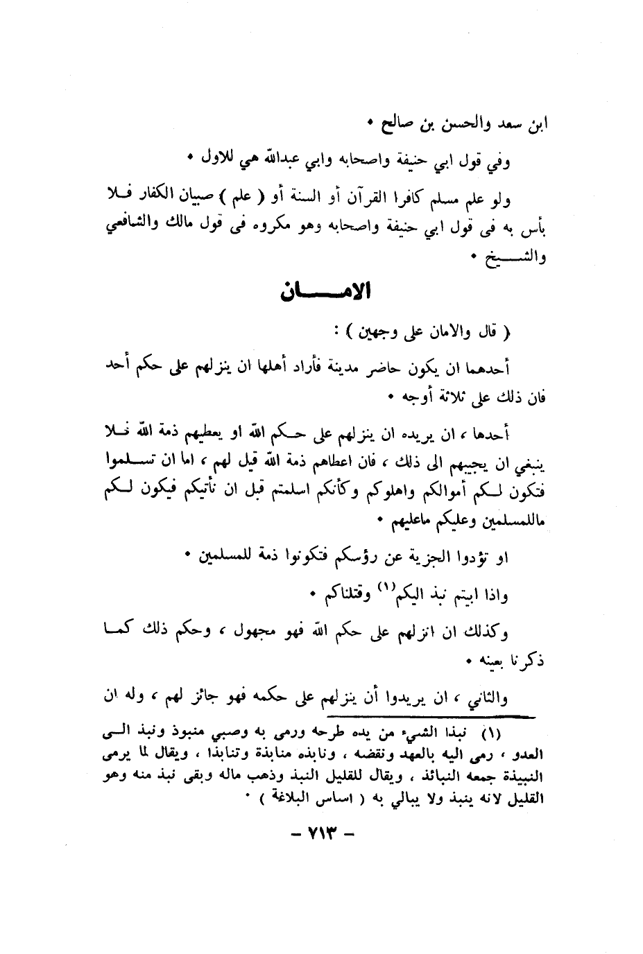 أَحدهَا ان يُريدهُ ان ينزلهم على حكم الله اَوْ يعطيهم ذمَّة الله فَلَا يَنْبَغِي ان يُجِيبهُمْ الى ذَلِك فان اعطاهم ذمَّة الله قيل لَهُم اما ان تسلموا فَتكون لكم أَمْوَالكُم واهلوكم وكأنكم اسلمتم قبل ان تَأْتيكُمْ فَيكون لكم مَا للْمُسلمين وَعَلَيْكُم مَا عَلَيْهِم