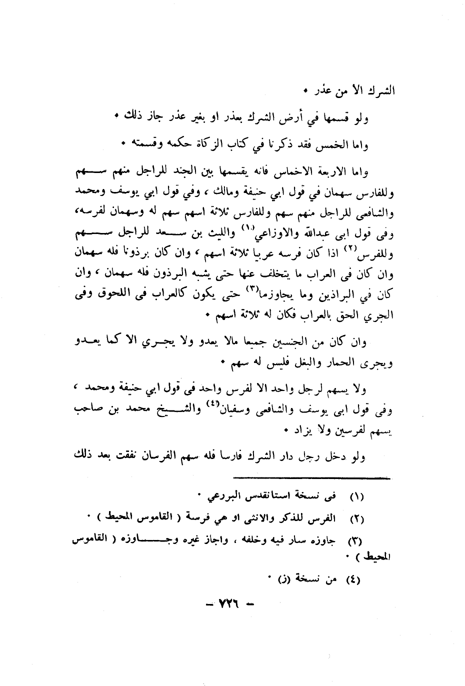 واما الاربعة الاخماس فانه يقسمها بَين الْجند للراجل مِنْهُم سهم وللفارس سَهْمَان فِي قَول ابي حنيفَة وَمَالك وَفِي قَول ابي يُوسُف وَمُحَمّد والشافعى للراجل مِنْهُم سهم وللفارس ثَلَاثَة اسهم سهم لَهُ وسهمان لفرسه وفى قَول ابى عبد الله والاوزاعي وَاللَّيْث بن سعد للراجل سهم وللفرس اذا كَانَ فرسه عَرَبيا ثَلَاثَة اسهم وان كَانَ برذونا فَلهُ سَهْمَان وان كَانَ فى العراب مَا يتَخَلَّف عَنْهَا حَتَّى يشبه البرذون فَلهُ سَهْمَان وان كَانَ فِي البراذين وَمَا يجاوزما حَتَّى يكون كالعراب فى اللحوق وفى الجري الْحق بالعراب فَكَانَ لَهُ ثَلَاثَة اسهم