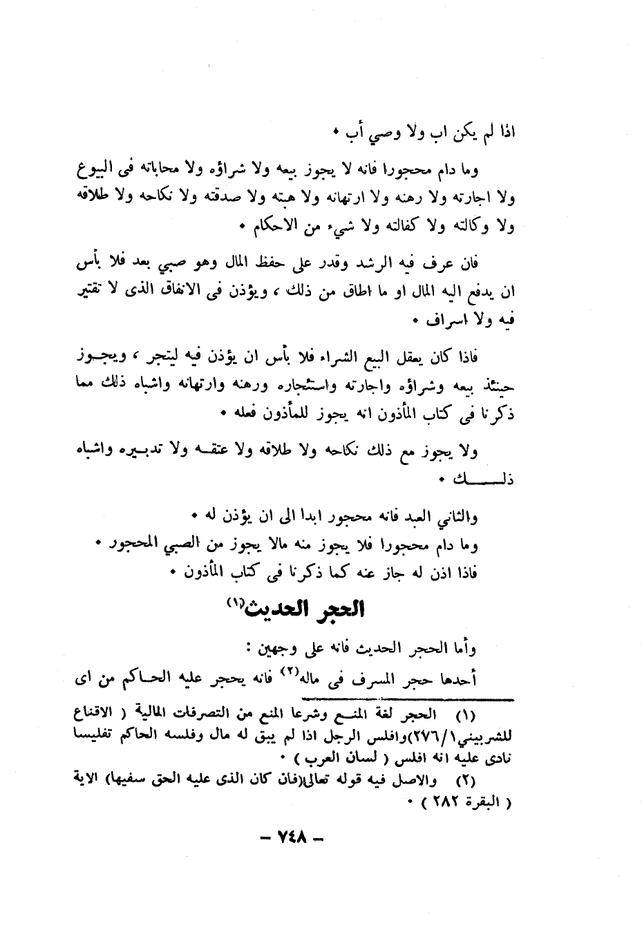 وَمَا دَامَ مَحْجُورا فانه لَا يجوز بَيْعه وَلَا شِرَاؤُهُ وَلَا محاباته فى الْبيُوع وَلَا اجارته وَلَا رَهنه وَلَا ارتهانه وَلَا هِبته وَلَا صدقته وَلَا نِكَاحه وَلَا طَلَاقه وَلَا وكَالَته وَلَا كفَالَته وَلَا شَيْء من الاحكام