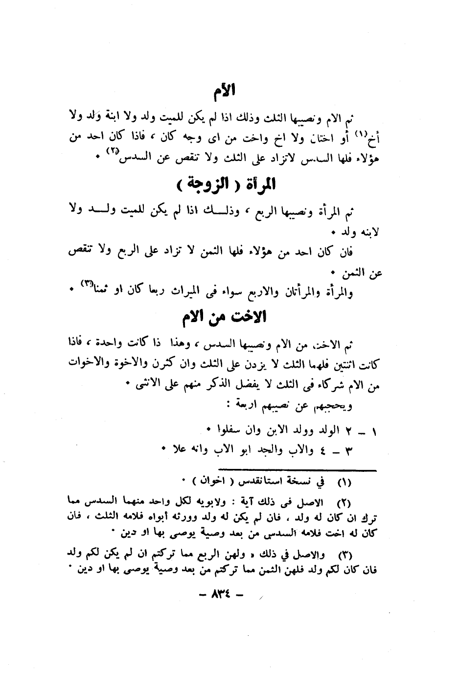 ثمَّ الام ونصيبها الثُّلُث وَذَلِكَ اذا لم يكن للْمَيت ولد وَلَا ابْنة ولد وَلَا أَخ أَو اختان وَلَا اخ واخت من اى وَجه كَانَ فاذا كَانَ اُحْدُ من هَؤُلَاءِ فلهَا السُّدس لَا تزاد على الثُّلُث وَلَا تنقص عَن السُّدس