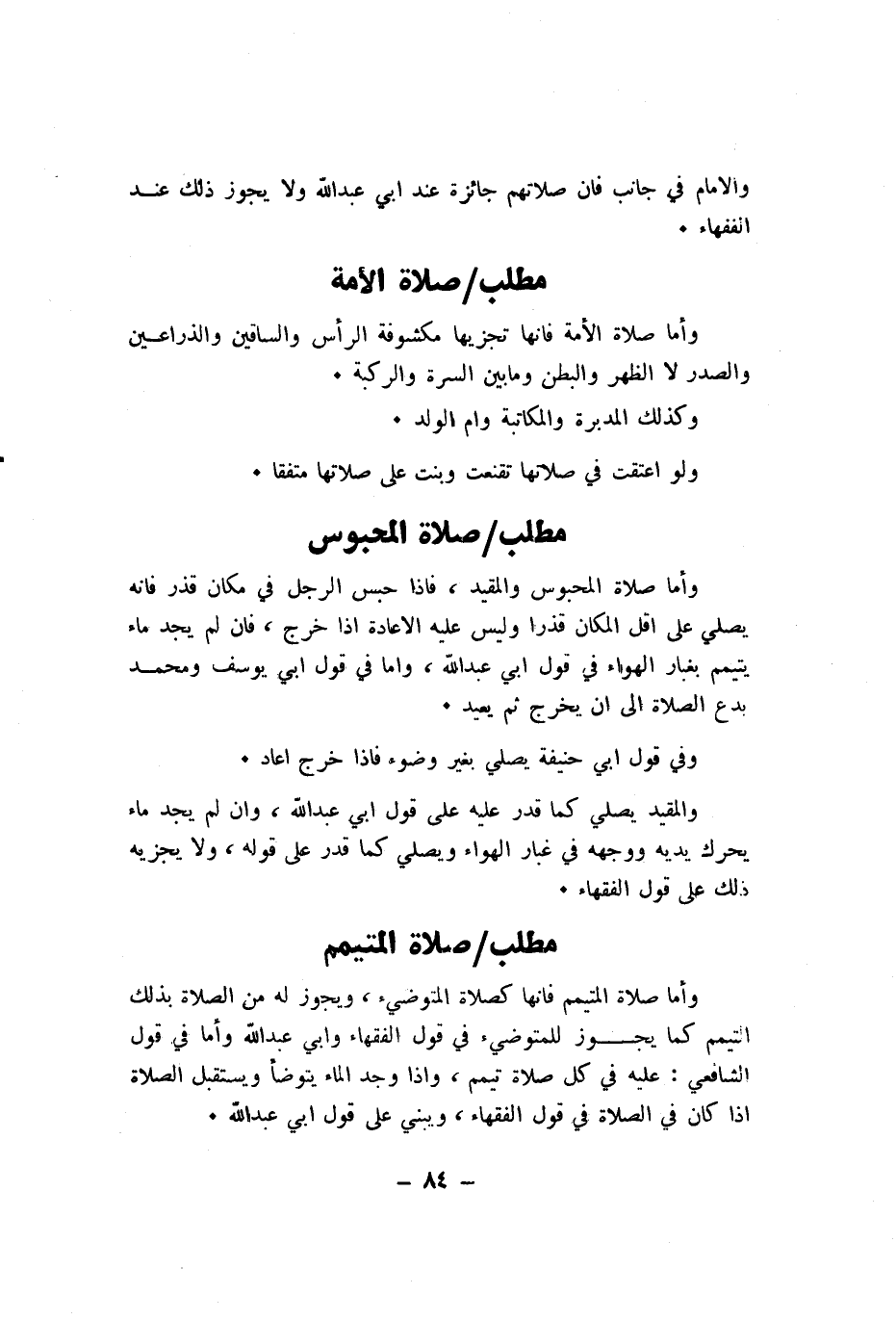 وَأما صَلَاة الْمُتَيَمم فانها كَصَلَاة الْمُتَوَضِّئ وَيجوز لَهُ من الصَّلَاة بذلك التَّيَمُّم كَمَا يجوز للمتوضئ فِي قَول الْفُقَهَاء وابي عبد الله وَأما فِي قَول الشَّافِعِي عَلَيْهِ فِي كل صَلَاة تيَمّم واذا وجد المَاء يتَوَضَّأ وَيسْتَقْبل الصَّلَاة اذا كَانَ فِي الصَّلَاة فِي قَول الْفُقَهَاء وَيَبْنِي على قَول ابي عبد الله