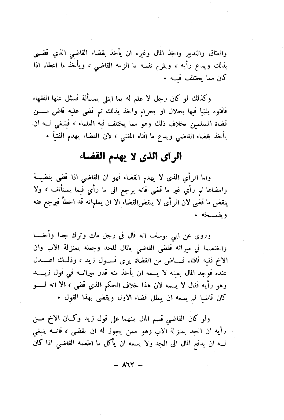 واما الرَّأْي الَّذِي لَا يهدم الْقَضَاء فَهُوَ ان القَاضِي اذا قضي بقضية وامضاها ثمَّ رَأْي غير مَا قضى فانه يرجع الى مَا رَأْي فِيمَا يسْتَأْنف وَلَا ينْقض مَا قضى لَان الرَّأْي لَا ينْقض الْقَضَاء الا ان يعلم انه قد اخطأ فَيرجع عَنهُ ويفسخه