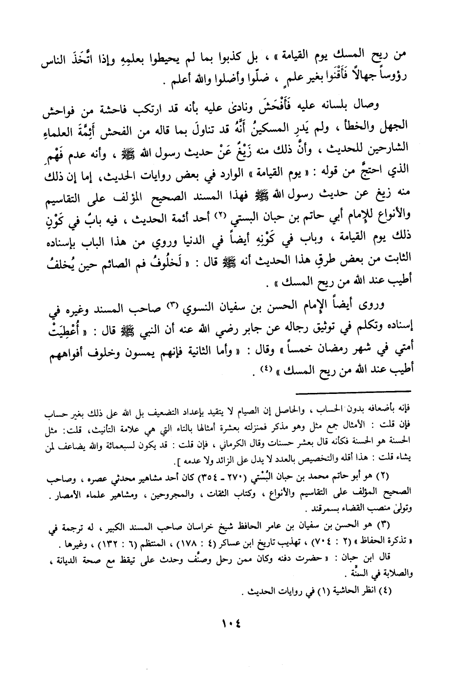 وصال بِلِسَانِهِ عَلَيْهِ فأفحش ونادى عَلَيْهِ بِأَنَّهُ قد ارْتكب فَاحِشَة من فواحش الْجَهْل وَالْخَطَأ وَلم يدر الْمِسْكِين أَنه قد تنَاول بِمَا قَالَه من الْفُحْش أَئِمَّة الْعلمَاء الشَّارِحين للْحَدِيث وَأَن ذَلِك مِنْهُ زيغ عَن حَدِيث رَسُول الله صلى الله عَلَيْهِ وَسلم وَأَنه عدم فهم الَّذِي احْتج من قَوْله يَوْم الْقِيَامَة الْوَارِد فِي بعض رِوَايَات الحَدِيث إِمَّا أَن ذَلِك مِنْهُ زيغ عَن حَدِيث رَسُول الله صلى الله عَلَيْهِ وَسلم فَهَذَا الْمسند الصَّحِيح الْمُؤلف على التقاسيم والأنواع للْإِمَام أبي حَاتِم بن حبَان البستي أحد أَئِمَّة الحَدِيث فِيهِ بَاب فِي كَون ذَلِك يَوْم الْقِيَامَة وَبَاب فِي كَونه أَيْضا فِي الدُّنْيَا وَرُوِيَ من هَذَا الْبَاب بِإِسْنَادِهِ الثَّابِت من بعض طرق هَذَا الحَدِيث أَنه صلى الله عَلَيْهِ وَسلم قَالَ لخلوف فَم الصَّائِم حِين يخلف أطيب عِنْد الله من ريح الْمسك