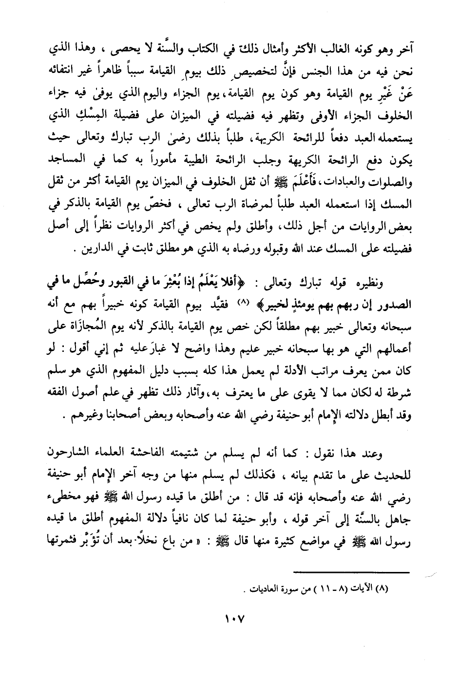 وَنَظِير قَوْله تبَارك وَتَعَالَى {أَفلا يعلم إِذا بعثر مَا فِي الْقُبُور وَحصل مَا فِي الصُّدُور إِن رَبهم بهم يَوْمئِذٍ لخبير} فقيد بِيَوْم الْقِيَامَة كَونه خَبِيرا بهم مَعَ أَنه سُبْحَانَهُ وَتَعَالَى خَبِير بهم مُطلقًا لَكِن خص يَوْم الْقِيَامَة بِالذكر لِأَنَّهُ يَوْم المجازاة على أَعْمَالهم الَّتِي هُوَ بهَا سُبْحَانَهُ خَبِير عليم وَهَذَا وَاضح لَا غُبَار عَلَيْهِ ثمَّ إِنِّي أَقُول لَو كَانَ مِمَّن يعرف مَرَاتِب الْأَدِلَّة لم يعْمل هَذَا كُله بِسَبَب دَلِيل الْمَفْهُوم الَّذِي هُوَ سلم شرطة لَهُ لَكَانَ مِمَّا لَا يقوى على مَا يعْتَرف بِهِ وآثار ذَلِك تظهر فِي علم أصُول الْفِقْه وَقد أبطل دلَالَته الإِمَام أَبُو حنيفَة رَضِي الله عَنهُ وَأَصْحَابه وَبَعض أَصْحَابنَا وَغَيرهم