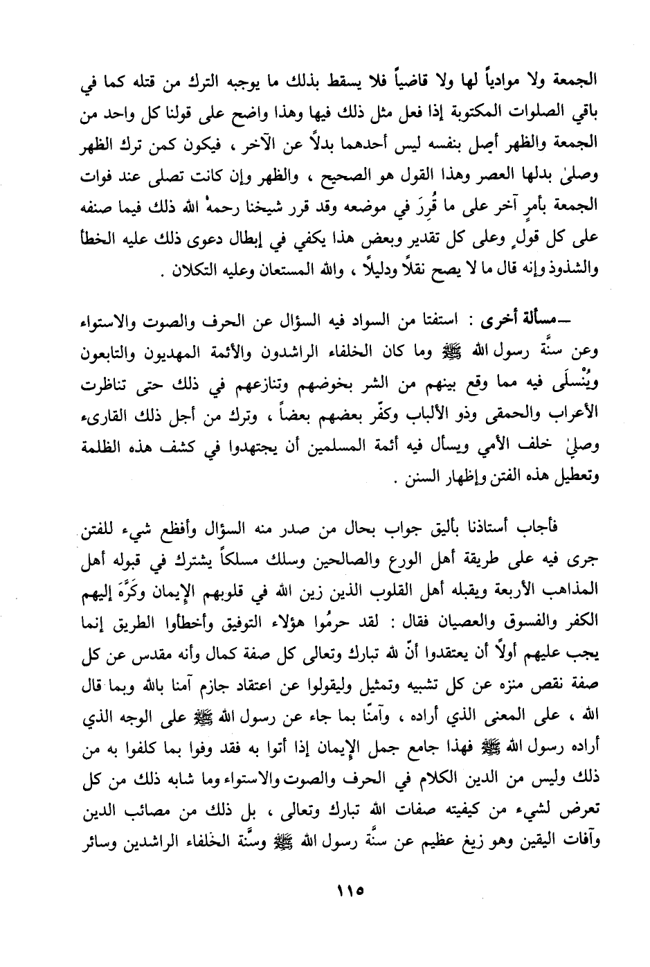 مَسْأَلَة أُخْرَى استفتا من السوَاد فِيهِ السُّؤَال عَن الْحَرْف وَالصَّوْت والاستواء وَعَن سنة رَسُول الله صلى الله عَلَيْهِ وَسلم وَمَا كَانَ الْخُلَفَاء الراشدون وَالْأَئِمَّة المهديون والتابعون وينسلى فِيهِ مِمَّا وَقع بَينهم من الشَّرّ بخوضهم وتنازعهم فِي ذَلِك حَتَّى تناظرت الْأَعْرَاب والحمقى وَذُو الْأَلْبَاب وَكفر بَعضهم بَعْضًا وَترك من أجل ذَلِك الْقَارئ وَصلي خلف الْأُمِّي وَيسْأل فِيهِ أَئِمَّة الْمُسلمين أَن يجتهدوا فِي كشف هَذِه الظلمَة وتعطيل هَذِه الْفِتَن وَإِظْهَار السّنَن