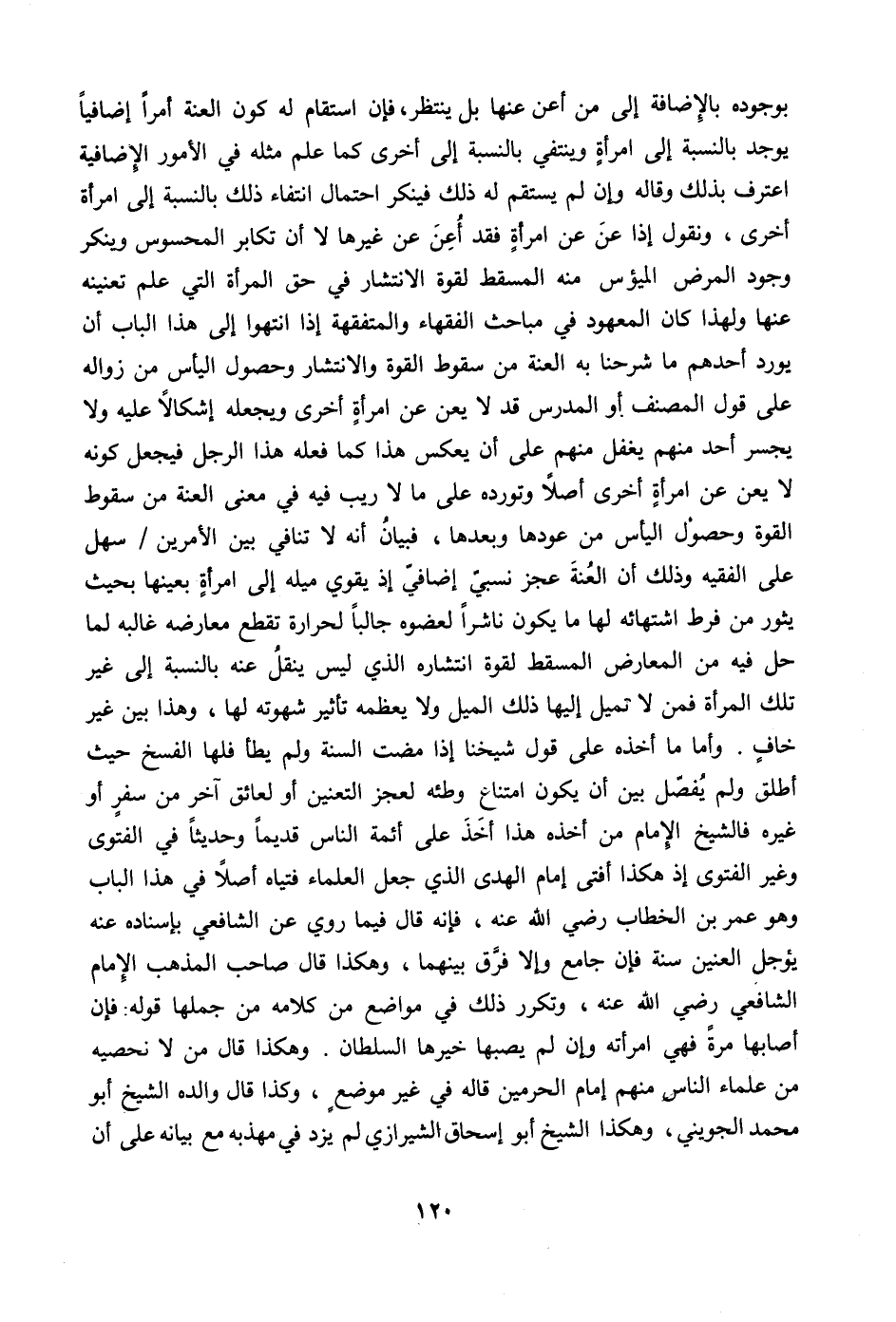 @ بِوُجُودِهِ بِالْإِضَافَة إِلَى من أعن عَنْهَا بل ينْتَظر فَإِن استقام لَهُ كَون الْعنَّة أمرا إضافيا يُوجد بِالنِّسْبَةِ إِلَى امْرَأَة وينتفي بِالنِّسْبَةِ إِلَى أُخْرَى كَمَا علم مثله فِي الْأُمُور الإضافية اعْترف بذلك وَقَالَهُ وَإِن لم يستقم لَهُ ذَلِك فينكر احْتِمَال انْتِفَاء ذَلِك بِالنِّسْبَةِ إِلَى امْرَأَة أُخْرَى ونقول إِذا عَن عَن امْرَأَة أعن فقد أعن عَن غَيرهَا لَا أَن تكابر المحسوس وينكر وجود الْمَرَض الميؤس مِنْهُ الْمسْقط لقُوَّة الانتشار فِي حق الْمَرْأَة الَّتِي علم تعنينه عَنْهَا وَلِهَذَا كَانَ الْمَعْهُود فِي مبَاحث الْفُقَهَاء والمتفقهة إِذا انْتَهوا إِلَى هَذَا الْبَاب أَن يُورد أحدهم مَا شرحنا بِهِ الْعنَّة من سُقُوط الْقُوَّة والانتشار وَحُصُول الْيَأْس من زَوَاله على قَول المُصَنّف أَو الْمدرس قد لَا يعن عَن امْرَأَة أُخْرَى ويجعله إشْكَالًا عَلَيْهِ وَلَا يَجْسُر أحد مِنْهُم يغْفل مِنْهُم على أَن يعكس هَذَا كَمَا فعله هَذَا الرجل فَيجْعَل كَونه لَا يعن عَن امْرَأَة أُخْرَى أصلا وتورده على مَا لَا ريب فِيهِ فِي معنى الْعنَّة من سُقُوط الْقُوَّة وَحُصُول الْيَأْس من عودهَا وَبعدهَا فبيان أَنه لَا تنَافِي بَين الْأَمريْنِ سهل على الْفَقِيه وَذَلِكَ أَن الْعنَّة عجز نسبي إضافي إِذْ يُقَوي ميله إِلَى امْرَأَة بِعَينهَا بِحَيْثُ يثور من فرط اشتهائه لَهَا مَا يكون ناشرا لعضوه جالبا لحرارة تقطع مُعَارضَة غالبه لما حل فِيهِ من الْمعَارض الْمسْقط لقُوَّة انتشاره الَّذِي لَيْسَ ينْقل عَنهُ بِالنِّسْبَةِ إِلَى غير تِلْكَ الْمَرْأَة فَمن لَا تميل إِلَيْهَا ذَلِك الْميل وَلَا يعظمه تَأْثِير شَهْوَته لَهَا وَهَذَا بَين غير خَافَ وَأما مَا أَخذه على قَول شَيخنَا إِذا مَضَت السّنة وَلم يطَأ فلهَا الْفَسْخ حَيْثُ أطلق وَلم يفصل بَين أَن يكون امْتنَاع وَطئه لعجز التعنين أَو لعائق آخر من سفر أَو غَيره فالشيخ الإِمَام من أَخذه هَذَا أَخذ على أَئِمَّة النَّاس قَدِيما وحديثا فِي الْفَتْوَى وَغير الْفَتْوَى إِذا هَكَذَا أفتى إِمَام الْهدى الَّذِي جعل الْعلمَاء فتياه أصلا فِي هَذَا الْبَاب وَهُوَ عمر بن الْخطاب رَضِي الله عَنهُ فَإِنَّهُ قَالَ فِيمَا روى الشَّافِعِي بِإِسْنَادِهِ عَنهُ يُؤَجل الْعنين سنة فَإِن جَامع وَلَا فرق بَينهمَا وَهَكَذَا قَالَ صَاحب الْمَذْهَب الإِمَام الشَّافِعِي رَضِي الله عَنهُ وتكرر ذَلِك فِي مَوَاضِع من كَلَامه من جملها قَوْله فَإِن أَصَابَهَا مرّة فَهِيَ امْرَأَته وَإِن لم يصبهَا خَيرهَا السُّلْطَان وَهَكَذَا قَالَ من لَا نحصيه من عُلَمَاء النَّاس مِنْهُم إِمَام الْحَرَمَيْنِ قَالَه فِي غير مَوضِع وَكَذَا قَالَ وَالِده الشَّيْخ أَبُو مُحَمَّد الْجُوَيْنِيّ وَهَكَذَا الشَّيْخ أَبُو إِسْحَاق الشِّيرَازِيّ لم يزدْ فِي مهذبه مَعَ بَيَانه على أَن