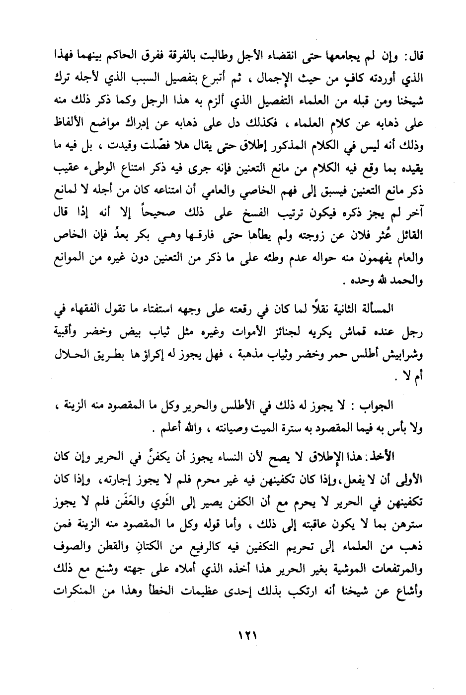 @ قَالَ وَإِن لم يُجَامِعهَا حَتَّى انْقِضَاء الْأَجَل وطالبت بالفرقة فَفرق الْحَاكِم بَينهمَا فَهَذَا الَّذِي أوردته كَاف من حَيْثُ الْإِجْمَال ثمَّ أتبرع بتفصيل السَّبَب الَّذِي لأَجله ترك شَيخنَا وَمن قبله من الْعلمَاء التَّفْصِيل الَّذِي ألزم بِهِ هَذَا الرجل وكما ذكر ذَلِك مِنْهُ على ذَهَابه عَن كَلَام الْعلمَاء فَكَذَلِك دلّ على ذَهَابه عَن إِدْرَاك مَوَاضِع الْأَلْفَاظ وَذَلِكَ أَنه لَيْسَ فِي الْكَلَام الْمَذْكُور إِطْلَاق حتي يُقَال هلا فصلت وقيدت بل فِيهِ مَا يُقَيِّدهُ بِمَا وَقع فِيهِ الْكَلَام من مَانع التعنين فَإِنَّهُ جرى فِيهِ ذكر امْتنَاع الوطئ عقيب ذكر مَانع التعنين فَيَسْبق إِلَى فهم الخاصي والعامي أَن امْتِنَاعه كَانَ من أَجله لَا لمَانع آخر لم يجز ذكره فَيكون تَرْتِيب الْفَسْخ على ذَلِك صَحِيحا إِلَّا أَنه إِذا قَالَ الْقَائِل عثر فلَان عَن زَوجته ولت يَطَأهَا حتي فَارقهَا وَهِي بكر بعد فَإِن الْخَاص وَالْعَام يفهمون مِنْهُ حواله عدم وَطئه مَا ذكر من التعنين دون غَيره من الْمَوَانِع وَالْحَمْد الله وَحده