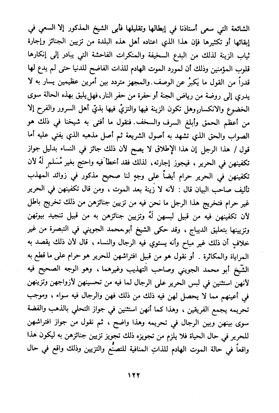 @ الشائعة الَّتِي سعى أستاذنا فِي إِبْطَالهَا وتقليلها فَأبى الشَّيْخ الْمَذْكُور إِلَّا السَّعْي فِي إبقائها أَو تكثيرها فَإِن هَذَا الَّذِي اعتاده أهل هَذِه الْبَلدة من تَزْيِين الْجَنَائِز وَإِجَارَة ثِيَاب الزِّينَة لذَلِك من الْبدع السخيفة والمنكرات الْفَاحِشَة الَّتِي يُبَادر إِلَى إنكارها قُلُوب الْمُؤمنِينَ وَذَلِكَ أَن لمورد الْمَوْت الهادم للذات الفاضح للدنيا حَتَّى لم يدع لَهَا قدرا من القَوْل مَا يكبر عَن الْوَصْف والمجهز مُتَرَدّد بَين أَمريْن عظيمين يسَار بِهِ لَا يدْرِي إِلَى رَوْضَة من رياض الْجنَّة أَو حُفْرَة من حفر النَّار فَهَل يَلِيق بِهَذِهِ الْحَالة سوى الخضوع والانكسار وَهل تكون الزِّينَة فِيهَا والتزي فِيهَا بِذِي أهل السرُور والفرح إِلَّا من أعظم الْحمق وأبلغ السَّرف والسخف فَنَقُول مَا أفتى بِهِ شَيخنَا فِي ذَلِك هُوَ الصَّوَاب وَالْحق الَّذِي تشهد بِهِ أصُول الشَّرِيعَة ثمَّ أصل مذْهبه الَّذِي يُفْتِي عَلَيْهِ أما قَول هَذَا الرجل إِن هَذَا الْإِطْلَاق لَا يَصح لِأَن ذَلِك جَائِز فِي النِّسَاء بِدَلِيل جَوَاز تكفينهن فِي الْحَرِير فَيجوز إِجَارَته لذَلِك فقد أَخطَأ فِيهِ وَاحْتج بِغَيْر مُسلم لَهُ لِأَن تكفينهن فِي الْحَرِير حرَام أَيْضا على وَجه لنا صَحِيح مَذْكُور فِي زَوَائِد الْمُهَذّب تأليف صَاحب الْبَيَان قَالَ لِأَنَّهُ لَا زِينَة بعد الْمَوْت وَمن قَالَ تكفينهن فِي الْحَرِير غير حرَام فتخريج هَذَا الرجل مَا نَحن فِيهِ من تَزْيِين جنائزهن من ذَلِك تَخْرِيج بَاطِل لِأَن تكفينهن فِيهِ من قبيل لبسهن لَهُ وتزيين جنائزهن بِهِ من قبيل تنجيد بُيُوتهنَّ وتزيينها بتعليق الديباج وَقد حكى الشَّيْخ أَبُو مُحَمَّد الْجُوَيْنِيّ فِي التَّبْصِرَة من غير خلاف أَن ذَلِك غير مُبَاح وَأَنه يَسْتَوِي فِيهِ الرِّجَال وَالنِّسَاء قَالَ لِأَن ذَلِك يقْصد بِهِ المراياة والمكاثرة أَو نقُول هُوَ من قبيل افتراشهن للحرير هُوَ حرَام على مَا قطع بِهِ الشَّيْخ أَبُو مُحَمَّد الْجُوَيْنِيّ وَصَاحب التَّهْذِيب وَغَيرهمَا وَهُوَ الْوَجْه الصَّحِيح فِيهِ لِأَنَّهُنَّ استثنين فِي لبس الْحَرِير على الرِّجَال لما فِيهِ من تحسينهن لِأَزْوَاجِهِنَّ وتزينهن فِي أَعينهم مِمَّا لَا يحصل لَهُنَّ فِيهِ ذَلِك من ذَلِك فهن وَالرِّجَال فِيهِ سَوَاء وَمُوجب تَحْرِيمه يجمع الْفَرِيقَيْنِ وَهَذَا كَمَا أَنَّهُنَّ استثنين فِي جَوَاز التحلي بِالذَّهَب وَالْفِضَّة سوى بَينهُنَّ وَبَين الرِّجَال فِي تَحْرِيمه وَهَذَا وَاضح ثمَّ نقُول من جَوَاز افتراشهن للحرير فِي حَال الْحَيَاة فَلَا يلْزم من تجويزه ذَلِك تَجْوِيز تَزْيِين جنائزهن بِهِ ليَكُون هَذَا وَاقعا فِي حَالَة الْمَوْت الهادم للذات المنافية للتصنع والتزيين وَذَلِكَ وَاقع فِي حَال