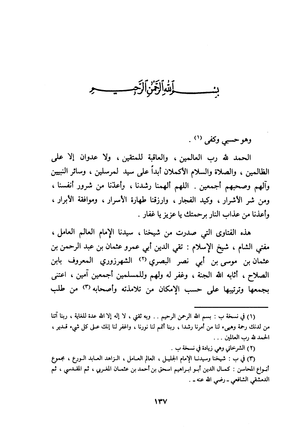 هَذِه الفتاوي الَّتِي صدرت من شَيخنَا سيدنَا الإِمَام الْعَالم الْعَامِل مفتي الشَّام شيخ الْإِسْلَام تَقِيّ الدّين أبي عَمْرو عُثْمَان بن عبد الرَّحْمَن بن عُثْمَان ابْن مُوسَى بن أبي نصر الْبَصْرِيّ الشهرزوري الْمَعْرُوف بِابْن الصّلاح أثابه الله الْجنَّة وَغفر لَهُ وَلَهُم وللمسلمين أَجْمَعِينَ آمين اعتنى بجمعها وترتيبها على حسب الْإِمْكَان من تلامذته وَأَصْحَابه من طلب