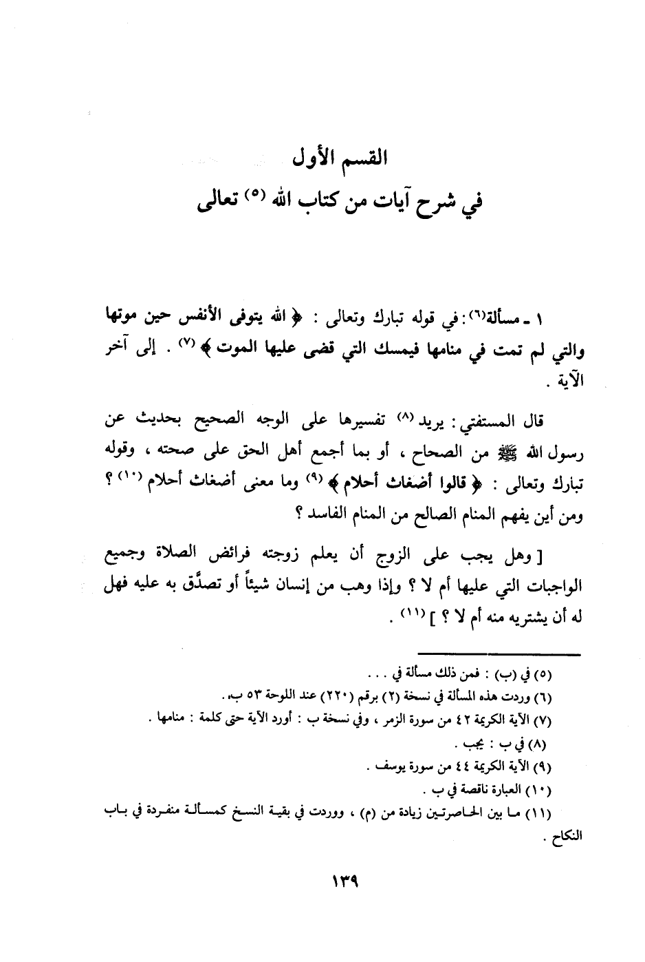 1 - مَسْأَلَة فِي قَوْله تبَارك وَتَعَالَى {الله يتوفى الْأَنْفس حِين مَوتهَا وَالَّتِي لم تمت فِي منامها فَيمسك الَّتِي قضى عَلَيْهَا الْمَوْت} إِلَى آخر الْآيَة