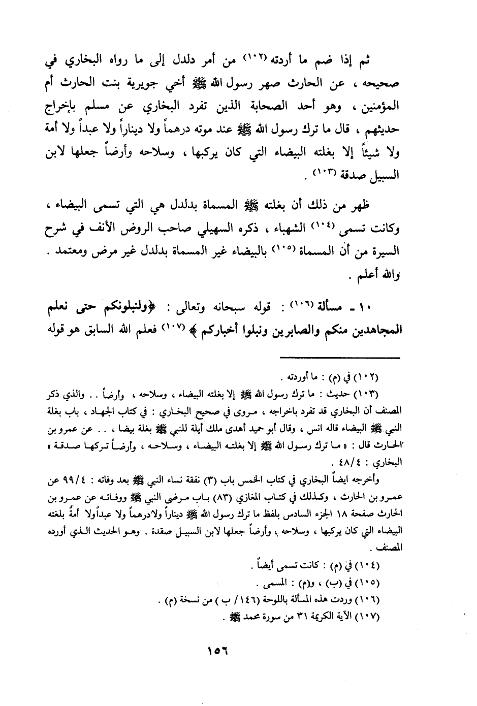 @ ثمَّ إِذا ضم مَا أردته من أَمر دُلْدُل إِلَى مَا رَوَاهُ البُخَارِيّ فِي صَحِيحه عَن الْحَارِث صهر رَسُول الله صلى الله عَلَيْهِ وَسلم أخي جوَيْرِية بنت الْحَارِث أم الْمُؤمنِينَ وَهُوَ أحد الصَّحَابَة الَّذين تفرد البُخَارِيّ عَن مُسلم بِإِخْرَاج حَدِيثهمْ قَالَ مَا ترك رَسُول الله صلى الله عَلَيْهِ وَسلم عِنْد مَوته درهما وَلَا دِينَارا وَلَا عبدا وَلَا أمة وَلَا شَيْئا إِلَّا بغلته الْبَيْضَاء الَّتِي كَانَ يركبهَا وسلاحه وأرضا جعلهَا لِابْنِ السَّبِيل صَدَقَة