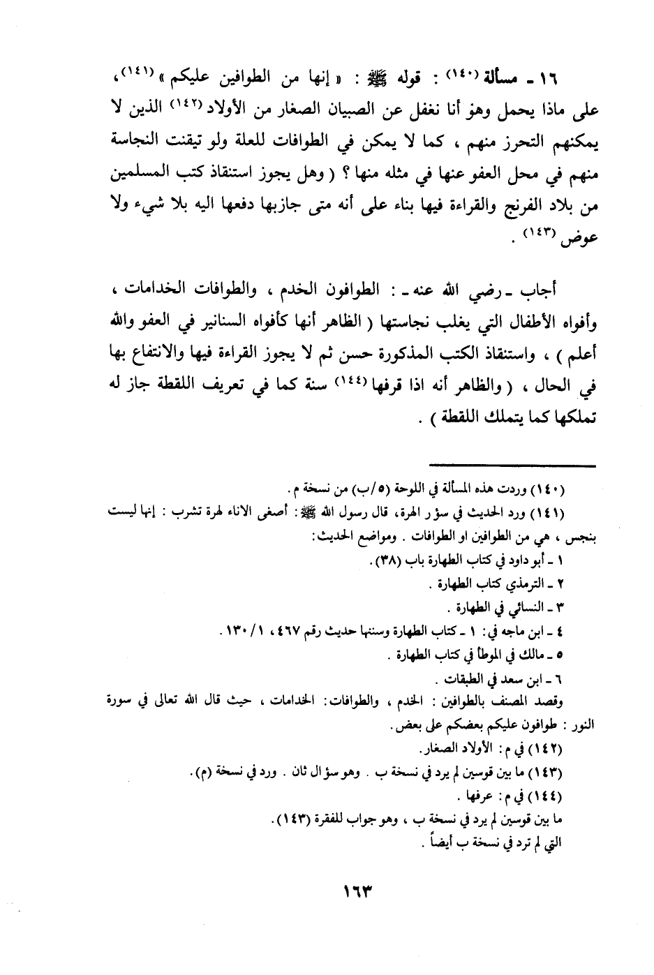 - مَسْأَلَة قَوْله صلى الله عَلَيْهِ وَسلم إِنَّهَا من الطوافين عَلَيْكُم على مَاذَا يحمل وَهُوَ أَنا نغفل عَن الصّبيان الصغار من الْأَوْلَاد الَّذين لَا يُمكنهُم التحرر مِنْهُم كَمَا لَا يُمكن فِي الطوافات لِلْعِلَّةِ وَلَو تيقنت النَّجَاسَة مِنْهُم فِي مَحل الْعَفو عَنْهَا فِي مثله مِنْهَا وَهل يجوز استنقاذ كتب الْمُسلمين من بِلَاد الفرنج وَالْقِرَاءَة فِيهَا بِنَاء على أَنه مَتى جَازَ بهَا دَفعهَا اليه بِلَا شَيْء وَلَا عوض