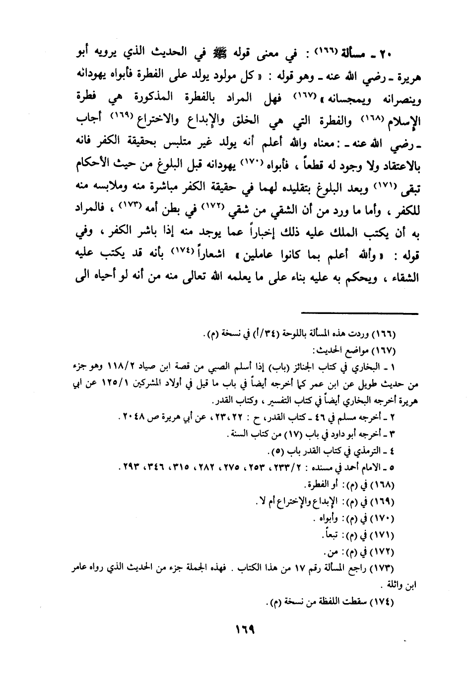 - مَسْأَلَة فِي معنى قَوْله صلى الله عَلَيْهِ وَسلم فِي الحَدِيث الَّذِي يرويهِ أَبُو هُرَيْرَة رَضِي الله عَنهُ وَهُوَ قَوْله كل مَوْلُود يُولد على الْفطْرَة فَأَبَوَاهُ يُهَوِّدَانِهِ وَيُنَصِّرَانِهِ ويمجسانه فَهَل المُرَاد بالفطرة الْمَذْكُورَة هِيَ فطْرَة الْإِسْلَام والفطرة الَّتِي هِيَ الْخلق والإبداع والاختراع أجَاب رَضِي الله عَنهُ مَعْنَاهُ وَالله أعلم أَنه يُولد غير متلبس بِحَقِيقَة الْكفْر فَإِنَّهُ بالاعتقاد وَلَا وجود قطعا فَأَبَوَاهُ يُهَوِّدَانِهِ قبل الْبلُوغ من حَيْثُ الْأَحْكَام تبقى وَبعد الْبلُوغ بتقليده لَهما فِي حَقِيقَة الْكفْر مُبَاشرَة مِنْهُ وملابسه مِنْهُ للكفر وَأما مَا ورد من أَن الشقي من شقي فِي بطن أمه فَالْمُرَاد بِهِ أَن يكْتب الْملك عَلَيْهِ ذَلِك إِخْبَارًا عَمَّا يُوجد مِنْهُ إِذا بَاشر الْكفْر وَفِي قَوْله وَالله أعلم بِمَا كَانُوا عاملين اشعارا بِأَنَّهُ قد يكْتب عَلَيْهِ الشَّقَاء وَيحكم بِهِ عَلَيْهِ بِنَاء على مَا يُعلمهُ الله تَعَالَى مِنْهُ من أَنه لَو أَحْيَاهُ الى