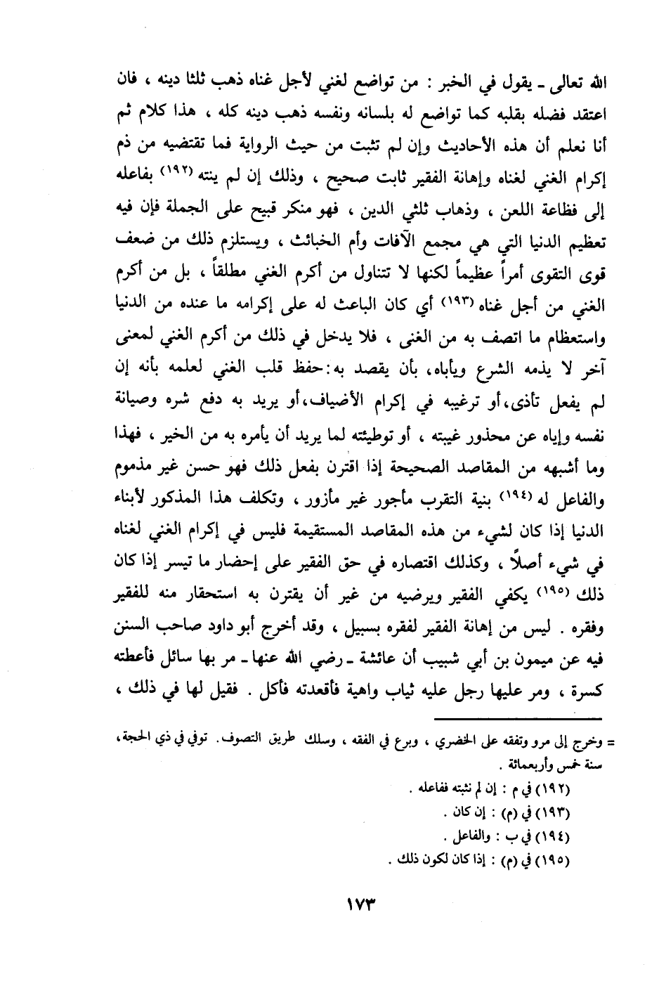 @ الله تَعَالَى يَقُول فِي الْخَبَر من تواضع لَغَنِيّ لأجل غناهُ ذهب ثلثا دينه فان اعْتقد فَضله بِقَلْبِه كَمَا تواضع لَهُ بِلِسَانِهِ وَنَفسه ذهب دينه كُله هَذَا كَلَام ثمَّ أَنا نعلم أَن هَذِه الْأَحَادِيث وَإِن لم تثبت من حَيْثُ الرِّوَايَة فَمَا تَقْتَضِيه من ذمّ إكرام الْغَنِيّ لغناه وإهانة الْفَقِير ثَابت صَحِيح وَذَلِكَ إِن لم ينْتَه بفاعله إِلَى فظاعة اللَّعْن وَذَهَاب ثُلثي الدّين فَهُوَ مُنكر قَبِيح على الْجُمْلَة فَإِن فِيهِ تَعْظِيم الدُّنْيَا الَّتِي هِيَ مجمع الْآفَات وَأم الْخَبَائِث ويستلزم ذَلِك من ضعف قوى التَّقْوَى أمرا عَظِيما لَكِنَّهَا لَا تتَنَاوَل من أكْرم الْغَنِيّ مُطلقًا بل من أكْرم الْغَنِيّ من أجل غناهُ أَي كَانَ الْبَاعِث لَهُ على إكرامه مَا عِنْده من الدُّنْيَا واستعظام مَا اتّصف بِهِ من الْغنى فَلَا يدْخل فِي ذَلِك من أكْرم الْغَنِيّ لِمَعْنى آخر لَا يذمه الشَّرْع ويأباه بِأَن يقْصد بِهِ حفظ قلب الْغَنِيّ لعلمه بِأَنَّهُ إِن لم يفعل تأذى أَو ترغيبه فِي إكرام الأضياف أَو يُرِيد بِهِ دفع شَره وصيانة نَفسه وإياه عَن مَحْذُور غيبته أَو توطيئته لما يُرِيد أَن يَأْمُرهُ بِهِ من الْخَيْر فَهَذَا وَمَا أشبهه من الْمَقَاصِد الصَّحِيحَة إِذا اقْترن بِفعل ذَلِك فَهُوَ حسن غير مَذْمُوم وَالْفَاعِل لَهُ بنية التَّقَرُّب مأجور غير مأزور وتكلف هَذَا الْمَذْكُور لأبناء الدُّنْيَا إِذا كَانَ لشَيْء من هَذِه الْمَقَاصِد المستقيمة فَلَيْسَ فِي إكرام الْغَنِيّ لغناه فِي شَيْء أصلا وَكَذَلِكَ اقْتِصَاره فِي حق الْفَقِير على إِحْضَار مَا تيَسّر إِذا كَانَ ذَلِك يَكْفِي الْفَقِير ويرضيه من غير أَن يقْتَرن بِهِ استحقار مِنْهُ للْفَقِير وَفَقره لَيْسَ من إهانة الْفَقِير لفقره بسبيل وَقد أخرج أَبُو دَاوُد صَاحب السّنَن فِيهِ عَن مَيْمُون بن أبي شبيب أَن عَائِشَة رَضِي الله عَنْهَا مر بهَا سَائل فَأَعْطَتْهُ كسرة وَمر عَلَيْهَا رجل عَلَيْهِ ثِيَاب واهية فأقعدته فَأكل فَقيل لَهَا فِي ذَلِك