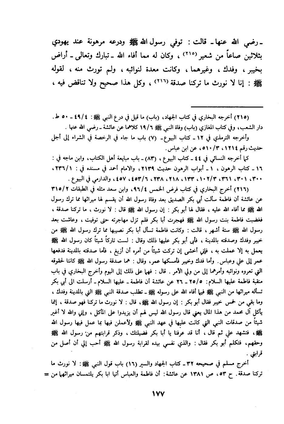 @ رَضِي الله عَنْهَا قَالَت توفّي رَسُول الله صلى الله عَلَيْهِ وَسلم ودرعة مَرْهُونَة عِنْد يَهُودِيّ بِثَلَاثِينَ صَاعا من شعير وَكَانَ لَهُ مِمَّا أَفَاء الله تبَارك وَتَعَالَى أراض بِخَيْبَر وفدك وَغَيرهمَا وَكَانَت معدة لنوائبه وَلم تورث مِنْهُ لقَوْله صلى الله عَلَيْهِ وَسلم إِنَّا لَا نورث مَا تركنَا صَدَقَة وكل هَذَا صَحِيح وَلَا تنَاقض فِيهِ