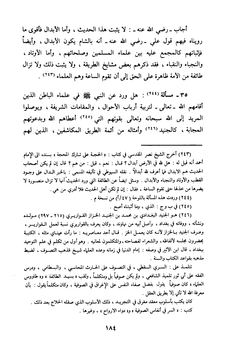 35 - مَسْأَلَة هَل ورد عَن النَّبِي صلى الله عَلَيْهِ وَسلم فِي عُلَمَاء الْبَاطِن الَّذين أقامهم الله تَعَالَى لتربية أَرْبَاب الْأَحْوَال والمقامات الشَّرِيفَة ويوصلوا المريد إِلَى الله سُبْحَانَهُ وَتَعَالَى بقوتهم الَّتِي أَعْطَاهُم الله وبدعوتهم المجابة كالجنيد وَأَمْثَاله من أَئِمَّة الطَّرِيق المكاشفين الَّذين لَهُم