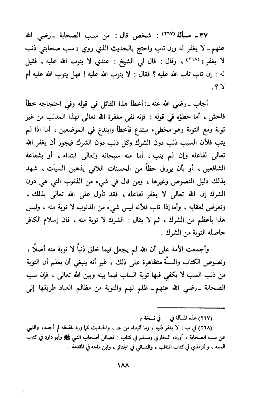 - مَسْأَلَة شخص قَالَ من سبّ الصَّحَابَة رَضِي الله عَنْهُم لَا يغْفر لَهُ وَإِن تَابَ وَاحْتج بِالْحَدِيثِ الَّذِي رُوِيَ سبّ صَحَابَتِي ذَنْب لَا يغْفر وَقَالَ قَالَ لي الشَّيْخ عِنْدِي لَا يَتُوب الله عَلَيْهِ فَقيل لَهُ إِن تَابَ تَابَ الله عَلَيْهِ فَقَالَ لَا يَتُوب الله عَلَيْهِ فَهَل يَتُوب الله عَلَيْهِ أم لَا