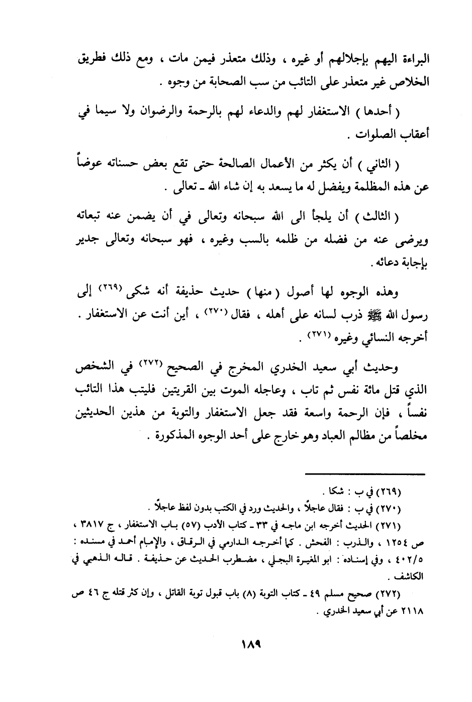 وَحَدِيث أبي سعيد الْخُدْرِيّ الْمخْرج فِي الصَّحِيح فِي الشَّخْص الَّذِي قتل مائَة نفس ثمَّ تَابَ وعاجله الْمَوْت بَين القريتين فليتب هَذَا التائب نفسا فَإِن الرَّحْمَة وَاسِعَة فقد جعل الاسْتِغْفَار وَالتَّوْبَة من هذَيْن الْحَدِيثين مخلصا من مظالم الْعباد وَهُوَ خَارج على أحد الْوُجُوه الْمَذْكُورَة