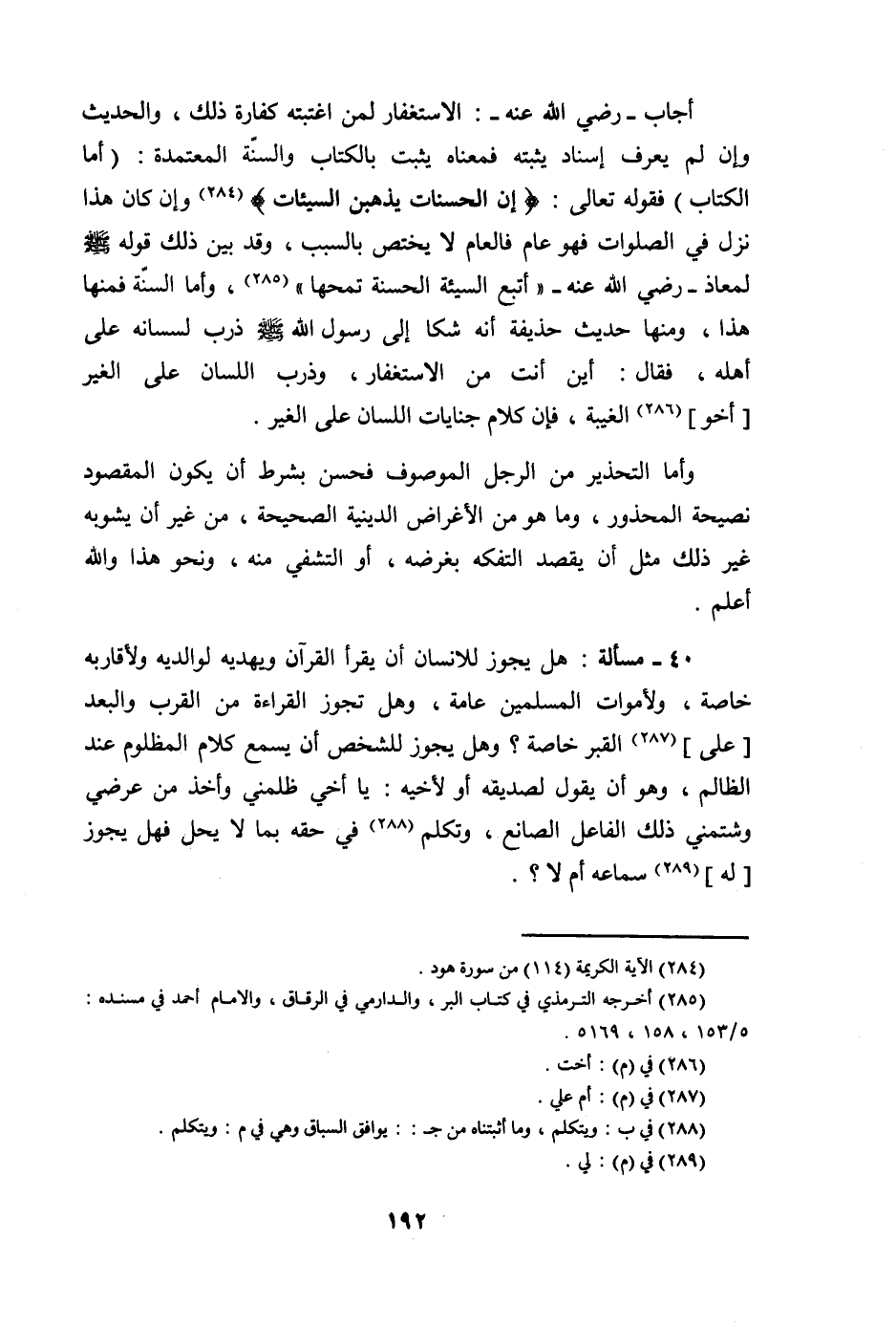 @ أجَاب رَضِي الله عَنهُ الاسْتِغْفَار لمن اغْتَبْته كَفَّارَة ذَلِك والْحَدِيث وَإِن لم يعرف إِسْنَاد يُثبتهُ فَمَعْنَاه يثبت بِالْكتاب وَالسّنة الْمُعْتَمدَة أما الْكتاب فَقَوله تَعَالَى إِن الْحَسَنَات يذْهبن السَّيِّئَات وَإِن كَانَ هَذَا نزل فِي الصَّلَوَات فَهُوَ عَام فالعام لَا يخْتَص بِالسَّبَبِ وَقد بَين ذَلِك قَوْله صلى الله عَلَيْهِ وَسلم لِمعَاذ رَضِي الله عَنهُ أتبع السَّيئَة الْحَسَنَة تمحها وَأما السّنة فَمِنْهَا هَذَا وَمِنْهَا حَدِيث حُذَيْفَة أَنه شكا إِلَى رَسُول الله صلى الله عَلَيْهِ وَسلم ذرب لِسَانه على أَهله فَقَالَ أَيْن أَنْت من الاسْتِغْفَار وذرب اللِّسَان على الْغَيْر أَخُو الْغَيْبَة فَإِن كَلَام جنايات اللِّسَان على الْغَيْر