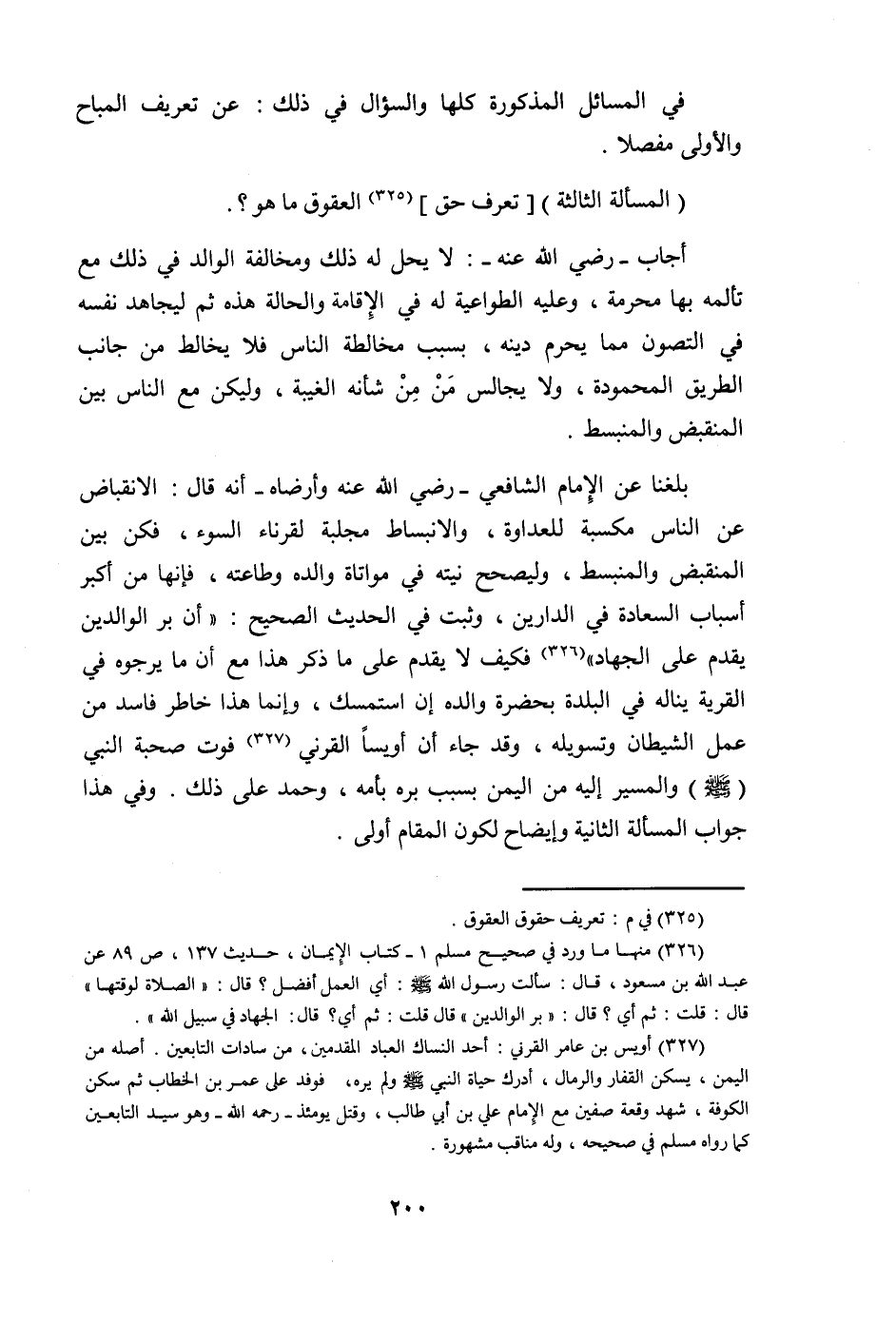 بلغنَا عَن الإِمَام الشَّافِعِي رَضِي الله عَنهُ وأرضاه أَنه قَالَ الانقباض عَن النَّاس مكسبة للعداوة والانبساط مجلبة لقرناء السوء فَكُن بَين المنقبض والمنبسط وليصحح نِيَّته فِي مواتاه وَالِده وطاعته فَإِنَّهَا من أكبر أَسبَاب السَّعَادَة فِي الدَّاريْنِ وَثَبت فِي الحَدِيث الصَّحِيح أَن بر الْوَالِدين يقدم على الْجِهَاد فَكيف لَا يقدم على مَا ذكر هَذَا مَعَ أَن مَا يرجوه فِي الْقرْيَة يَنَالهُ فِي الْبَلدة بِحَضْرَة وَالِده إِن استمسك وَإِنَّمَا هَذَا خاطر فَاسد من عمل الشَّيْطَان وتسويله وَقد جَاءَ أَن أويسا الْقَرنِي فَوت صُحْبَة النَّبِي صلى الله عَلَيْهِ وَسلم والمسير إِلَيْهِ من الْيمن بِسَبَب بره بِأُمِّهِ وَحمد على ذَلِك وَفِي هَذَا جَوَاب الْمَسْأَلَة الثَّانِيَة وإيضاح لكَون الْمقَام أولى