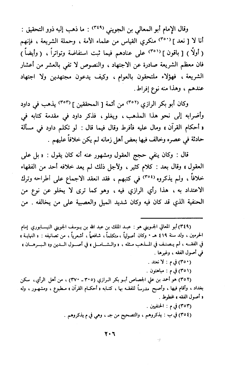 وَقَالَ الإِمَام أَبُو الْمَعَالِي بن الْجُوَيْنِيّ مَا ذهب إِلَيْهِ ذَوُو التَّحْقِيق أَنا لَا نعد منكري الْقيَاس من عُلَمَاء الْأمة وَحَملَة الشَّرِيعَة فَإِنَّهُم أَولا باقون على عنادهم فِيمَا ثَبت استفاضة وتواترا وَأَيْضًا فان مُعظم الشَّرِيعَة صادرة عَن الِاجْتِهَاد والنصوص لَا تفي بالعشر من أعشار الشَّرِيعَة فَهَؤُلَاءِ ملتحقون بالعوام وَكَيف يدعونَ مجتهدين وَلَا اجْتِهَاد عِنْدهم وَهَذَا مِنْهُ نوع إفراط