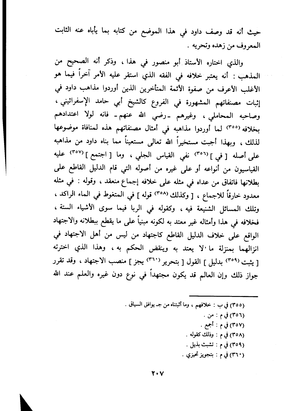 وَالَّذِي اخْتَارَهُ الْأُسْتَاذ أَبُو مَنْصُور فِي هَذَا وَذكر أَنه الصَّحِيح من الْمَذْهَب أَنه يعْتَبر خِلَافه فِي الْفِقْه الَّذِي اسْتَقر عَلَيْهِ الْأَمر آخرا فِيمَا هُوَ الْأَغْلَب الأعرف من صفوة الْأَئِمَّة الْمُتَأَخِّرين الَّذين أوردوا مَذَاهِب دَاوُد فِي إِثْبَات مصنفاتهم الْمَشْهُورَة فِي الْفُرُوع كالشيخ أبي حَامِد الإسفرائيني وَصَاحبه الْمحَامِلِي وَغَيرهم رَضِي الله عَنْهُم فانه لَوْلَا اعتدادهم بِخِلَافِهِ لما أوردوا مذاهبه فِي أَمْثَال مصنفاتهم هَذِه لمنافاة موضوعها لذَلِك وَبِهَذَا أجبْت مستخيرا الله تَعَالَى مستعينا مِمَّا بناه دَاوُد من مذاهبه على أَصله فِي نفي الْقيَاس الْجَلِيّ وَمَا اجْتمع عَلَيْهِ القياسيون من أَنْوَاعه أَو على غَيره من أُصُوله الَّتِي قَامَ الدَّلِيل الْقَاطِع على بُطْلَانهَا فاتفاق من عداهُ فِي مثله على خِلَافه إِجْمَاع مُنْعَقد وَقَوله فِي مثله مَعْدُود خارقا للاجماع وَكَذَلِكَ قَوْله فِي المتغوط فِي المَاء الراكد وَتلك الْمسَائِل الشنيعة فِيهِ وَكَقَوْلِه فِي الرِّبَا فِيمَا سوى الْأَشْيَاء السِّتَّة فخلافه فِي هَذَا وَأَمْثَاله غير مُعْتَد بِهِ لكَونه مَبْنِيا على مَا يقطع بِبُطْلَانِهِ وَالِاجْتِهَاد الْوَاقِع على خلاف الدَّلِيل الْقَاطِع كاجتهاد من لَيْسَ من أهل الِاجْتِهَاد فِي انزالهما بِمَنْزِلَة مَا لَا يعْتد بِهِ وينقض الحكم بِهِ وَهَذَا الَّذِي اخترته يثبت بِدَلِيل القَوْل بتحرير يجز منصب الِاجْتِهَاد وَقد تقرر جَوَاز ذَلِك وَإِن الْعَالم قد يكون مُجْتَهدا فِي نوع دون غَيره وَالْعلم عِنْد الله