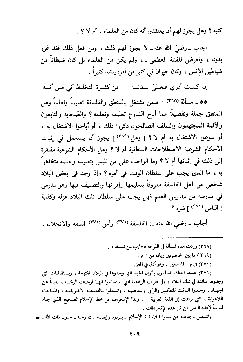 55 - مَسْأَلَة فِيمَن يشْتَغل بالْمَنْطق والفلسفة تَعْلِيما وتعلما وَهل الْمنطق جملَة وتفصيلا مِمَّا أَبَاحَ الشَّارِع تَعْلِيمه وتعلمه وَالصَّحَابَة والتابعون وَالْأَئِمَّة المجتهدون وَالسَّلَف الصالحون ذكرُوا ذَلِك أَو أباحوا الِاشْتِغَال بِهِ أَو سوغوا الِاشْتِغَال بِهِ أم لَا وَهل يجوز أَن يسْتَعْمل فِي إِثْبَات الْأَحْكَام الشَّرِيعَة الاصطلاحات المنطقية أم لَا وَهل الْأَحْكَام الشَّرْعِيَّة مفتقرة إِلَى ذَلِك فِي إِثْبَاتهَا أم لَا وَمَا الْوَاجِب على من تلبس بتعليمه وتعلمه متظاهرا بِهِ مَا الَّذِي يجب على سُلْطَان الْوَقْت فِي أمره وَإِذا وجد فِي بعض الْبِلَاد شخص من أهل الفلسفة مَعْرُوفا بتعليمها وإقرائها والتصنيف فِيهَا وَهُوَ مدرس فِي مدرسة من مدارس الْعلم فَهَل يجب على سُلْطَان تِلْكَ الْبِلَاد عَزله وكفاية النَّاس شَره