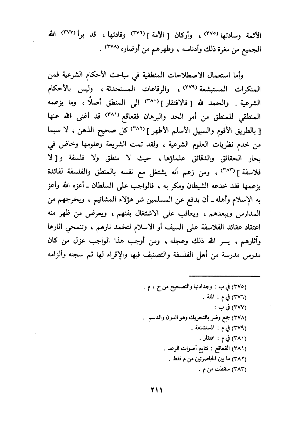 وَأما اسْتِعْمَال الاصطلاحات المنطقية فِي مبَاحث الْأَحْكَام الشَّرْعِيَّة فَمن الْمُنْكَرَات المستبشعة والرقاعات المستحدثة وَلَيْسَ بِالْأَحْكَامِ الشَّرْعِيَّة وَالْحَمْد الله فالافتقار إِلَى الْمنطق أصلا وَمَا يزعمه المنطقي للمنطق من أَمر الْحَد والبرهان فقعاقع قد أغْنى الله عَنْهَا بِالطَّرِيقِ الأقوم والسبيل الأسلم الأطهر كل صَحِيح الذِّهْن لَا سِيمَا من خدم نظريات الْعُلُوم الشَّرْعِيَّة وَلَقَد تمت الشَّرِيعَة وعلومها وخاض فِي بحار الْحَقَائِق والدقائق علماؤها حَيْثُ لَا منطق وَلَا فلسفة وَلَا فلاسفة وَمن زعم أَنه يشْتَغل مَعَ نَفسه بالْمَنْطق والفلسفة لفائدة يزعمها فقد خدعه الشَّيْطَان ومكر بِهِ فَالْوَاجِب على السُّلْطَان أعزه الله وأعز بِهِ الْإِسْلَام وَأَهله أَن يدْفع عَن المسملين شَرّ هَؤُلَاءِ المشائيم ويخرجهم من الْمدَارِس ويبعدهم ويعاقب على الِاشْتِغَال بفنهم ويعرض من ظهر مِنْهُ اعْتِقَاد عقائد الفلاسفة على السَّيْف أَو الاسلام لتخمد نارهم وتنمحي آثارها وآثارهم يسر الله ذَلِك وعجله وَمن أوجب هَذَا الْوَاجِب عزل من كَانَ مدرس مدرسة من أهل الفلسفة والتصنيف فِيهَا والإقراء لَهَا ثمَّ سجنه وألزامه