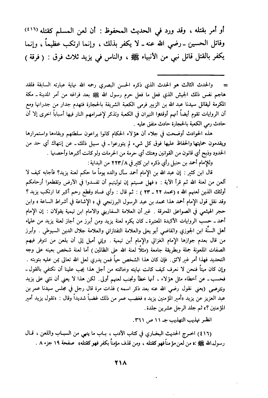 @ أَو أَمر بقتْله وَقد ورد فِي الحَدِيث الْمَحْفُوظ أَن لعن الْمُسلم كقتله وَقَاتل الْحُسَيْن رَضِي الله عَنهُ لَا يكفر بذلك وَإِنَّمَا ارْتكب عَظِيما وَإِنَّمَا يكفر بِالْقَتْلِ قَاتل نَبِي من الْأَنْبِيَاء صلى الله عَلَيْهِ وَسلم وَالنَّاس فِي يزِيد ثَلَاث فرق فرقة