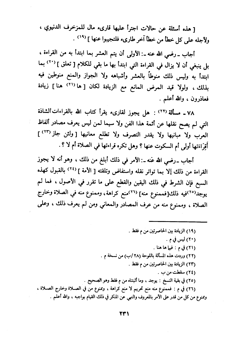 78 - مَسْأَلَة هَل يجوز لقارئ يقْرَأ كتاب الله بالقراءات الشاذة الَّتِي لم يَصح نقلهَا من أَئِمَّة هَذَا الْفَنّ وَلَا سِيمَا لمن لَيْسَ يعرف مصَادر أَلْفَاظ الْعَرَب وَلَا مبانيها وَلَا يقدر التَّصَرُّف وَلَا تطلع مَعَانِيهَا وَلَئِن جَازَ أقراءتها أولي أم السُّكُوت عَنْهَا وَهل تكره قرَاءَتهَا فِي الصَّلَاة أم لَا