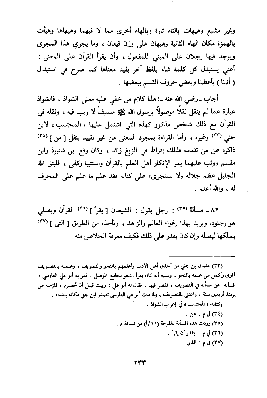 أجَاب رَضِي الله عَنهُ هَذَا كَلَام من خَفِي عَلَيْهِ معنى الشواذ فالشواذ عبارَة عَمَّا لم ينْقل نقلا موصلا برَسُول الله صلى الله عَلَيْهِ وَسلم مُسْتَيْقنًا لَا ريب فِيهِ وَنَقله فِي الْقُرْآن مَعَ ذَلِك شخص مَذْكُور كهذه الَّتِي اشْتَمَل عَلَيْهَا الْمُحْتَسب لِابْنِ جني وَغَيره وَأما الْقِرَاءَة بِمُجَرَّد الْمَعْنى من غير تَقْيِيد بِنَقْل من ذاكره عَن من تقدمه فَذَلِك إفراط فِي الزيغ زَائِد وَكَانَ وَقع ابْن شنبوذ وَابْن مقسم ووثب عَلَيْهِمَا بمر الْإِنْكَار أهل الْعلم بِالْقُرْآنِ واستتيبا وَكفى فليتق الله الْجَلِيل عظم جَلَاله وَلَا يستجرئ على كِتَابه فقد علم مَا علم على المحرف لَهُ وَالله أعلم