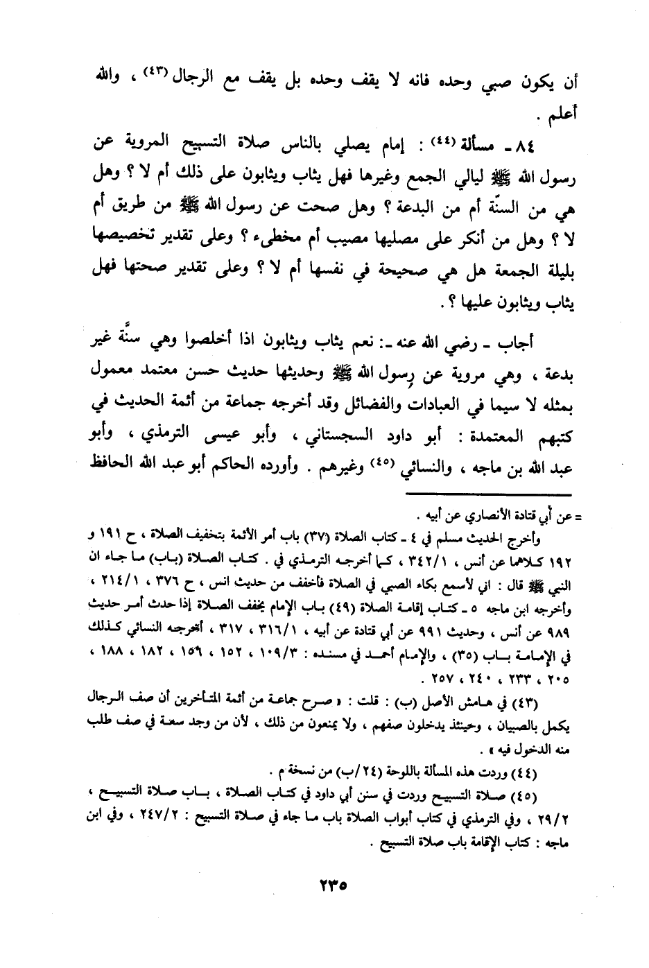 84 - مَسْأَلَة إِمَام يُصَلِّي بِالنَّاسِ صَلَاة التَّسْبِيح المروية عَن رَسُول الله صلى الله عَلَيْهِ وَسلم ليَالِي الْجمع وَغَيرهَا فَهَل يُثَاب ويثابون على ذَلِك أم لَا وَهل هِيَ من السّنة أم من الْبِدْعَة وَهل صحت عَن رَسُول الله صلى الله عَلَيْهِ وَسلم من طَرِيق أم لَا وَهل من أنكر على مصليها مُصِيب أم مُخطئ وعَلى تَقْدِير تخصيصها بليلة الْجُمُعَة هَل هِيَ صَحِيحَة فِي نَفسهَا أم لَا وعَلى تَقْدِير صِحَّتهَا فَهَل يُثَاب ويثابون عَلَيْهَا