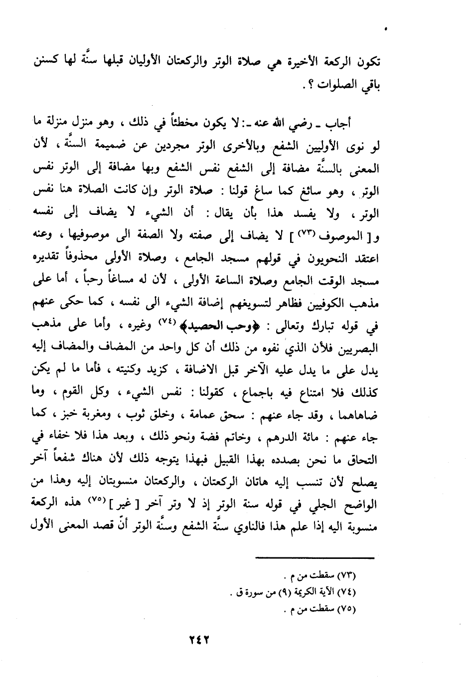 أجَاب رَضِي الله عَنهُ لَا يكون مخطئا فِي ذَلِك وَهُوَ منزل منزلَة مَا لَو نوى الْأَوليين الشفع وبالأخري الْوتر مجردين عَن ضميمة السّنة لِأَن المعني بِالسنةِ مُضَافَة إِلَى الشفع نفس الشفع وَبهَا مُضَافَة إِلَى الْوتر نفس الْوتر وَهُوَ سَائِغ كَمَا سَاغَ قَوْلنَا صَلَاة الْوتر وَإِن كَانَت الصَّلَاة هُنَا نفس الْوتر وَلَا يفْسد هَذَا بِأَن يُقَال أَن الشئ لَا يُضَاف إِلَى نَفسه والموصوف لَا يُضَاف إِلَى صفته وَلَا الصّفة إِلَيّ موصوفيها وَعنهُ اعْتقد النحويون فِي قَوْلهم مَسْجِد الْجَامِع وَصَلَاة الأولى محذوفا تقديرة مَسْجِد الْوَقْت الْجَامِع وَصَلَاة السَّاعَة الأولى لِأَن لَهُ مساغا رحبا أما على مَذْهَب الْكُوفِيّين فَظَاهر لتسويفهم إِضَافَة الشَّيْء إِلَى نَفسه كَمَا حكى عَنْهُم فِي قَوْله تبَارك وَتَعَالَى {وَحب الحصيد} وَغَيره وَأما على مَذْهَب الْبَصرِيين فَلِأَن الَّذِي نفوه من ذَلِك أَن كل وَاحِد من الْمُضَاف والمضاف إِلَيْهِ يدل على مَا يدل عَلَيْهِ الآخر قبل الاضافة كزيد وكنيته فَأَما مَا لم يكن كَذَلِك فلاامتناع فِيهِ بِإِجْمَاع كَقَوْلِنَا نفس الشَّيْء وكل الْقَوْم وَمَا ضاهاهما وَقد جَاءَ عَنْهُم سحق عِمَامَة وَخلق ثوب ومغربة خبز كَمَا جَاءَ عَنْهُم مائَة الدِّرْهَم وَخَاتم فضَّة وَنَحْو ذَلِك وَبعد هَذَا فَلَا خَفَاء فِي التحاق مَا نَحن بصدده بِهَذَا الْقَبِيل فَبِهَذَا يتَوَجَّه ذَلِك لِأَن هُنَاكَ شفعا آخر يصلح لِأَن تنْسب إِلَيْهِ هَاتَانِ الركعتان والركعتان منسوبتان إِلَيْهِ وَهَذَا من الْوَاضِح الْجَلِيّ فِي قَوْله سنة الْوتر إِذْ لَا وتر آخر غير هَذِه الرَّكْعَة منسوبة إِلَيْهِ إِذا علم هَذَا فالناوي سنة الشفع وَسنة الْوتر أَن قصد الْمَعْنى الأول
