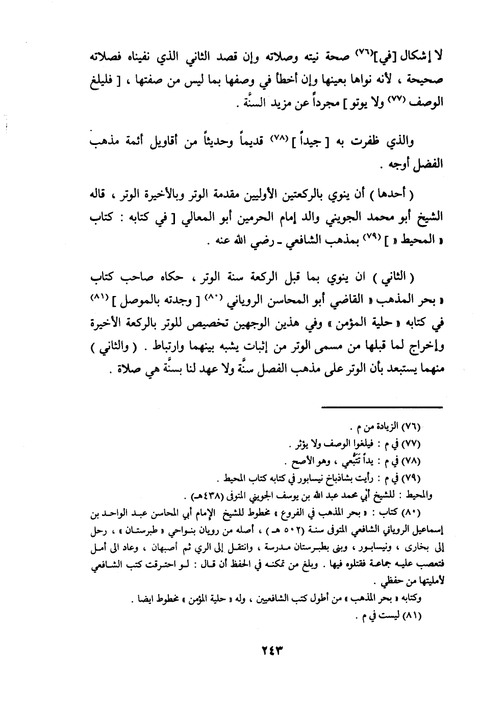 الثَّانِي ان يَنْوِي بِمَا قبل الرَّكْعَة سنة الْوتر حَكَاهُ صَاحب كتاب بَحر الْمَذْهَب القَاضِي أَبُو المحاسن الرَّوْيَانِيّ وجدته بالموصل فِي كِتَابه حلية الْمُؤمن وَفِي هذَيْن الْوَجْهَيْنِ تَخْصِيص للوتر بالركعة الْأَخِيرَة وَإِخْرَاج لما قبلهَا من مُسَمّى الْوتر من إِثْبَات يشبه بَينهمَا وارتباط وَالثَّانِي مِنْهُمَا يستبعد بِأَن الْوتر على مَذْهَب الْفَصْل سنة وَلَا عهد لنا بِسنة هِيَ صَلَاة