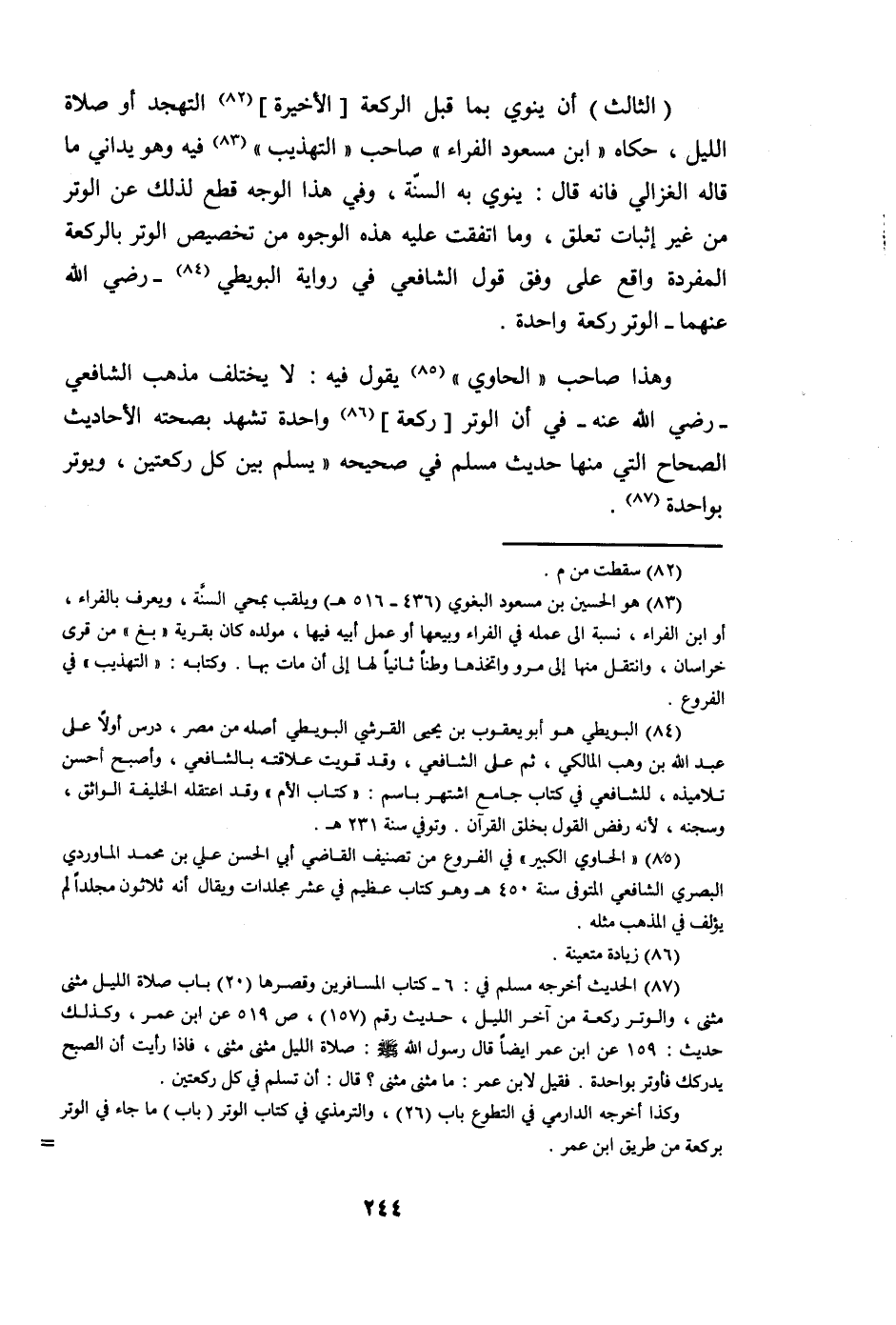 @ الثَّالِث أَن يَنْوِي بِمَا قبل الرَّكْعَة الْأَخِيرَة التَّهَجُّد أَو صَلَاة اللَّيْل حَكَاهُ ابْن مَسْعُود الْفراء صَاحب التَّهْذِيب فِيهِ وَهُوَ يداني مَا قَالَه الْغَزالِيّ فانه قَالَ يَنْوِي بِهِ السّنة وَفِي هَذَا الْوَجْه قطع لذَلِك عَن الْوتر من غير إِثْبَات تعلق وَمَا اتّفقت عَلَيْهِ هَذِه الْوُجُوه من تَخْصِيص الْوتر بالركعة المفردة وَاقع على وفْق قَول الشَّافِعِي فِي رِوَايَة الْبُوَيْطِيّ رَضِي الله عَنْهُمَا الْوتر رَكْعَة وَاحِدَة