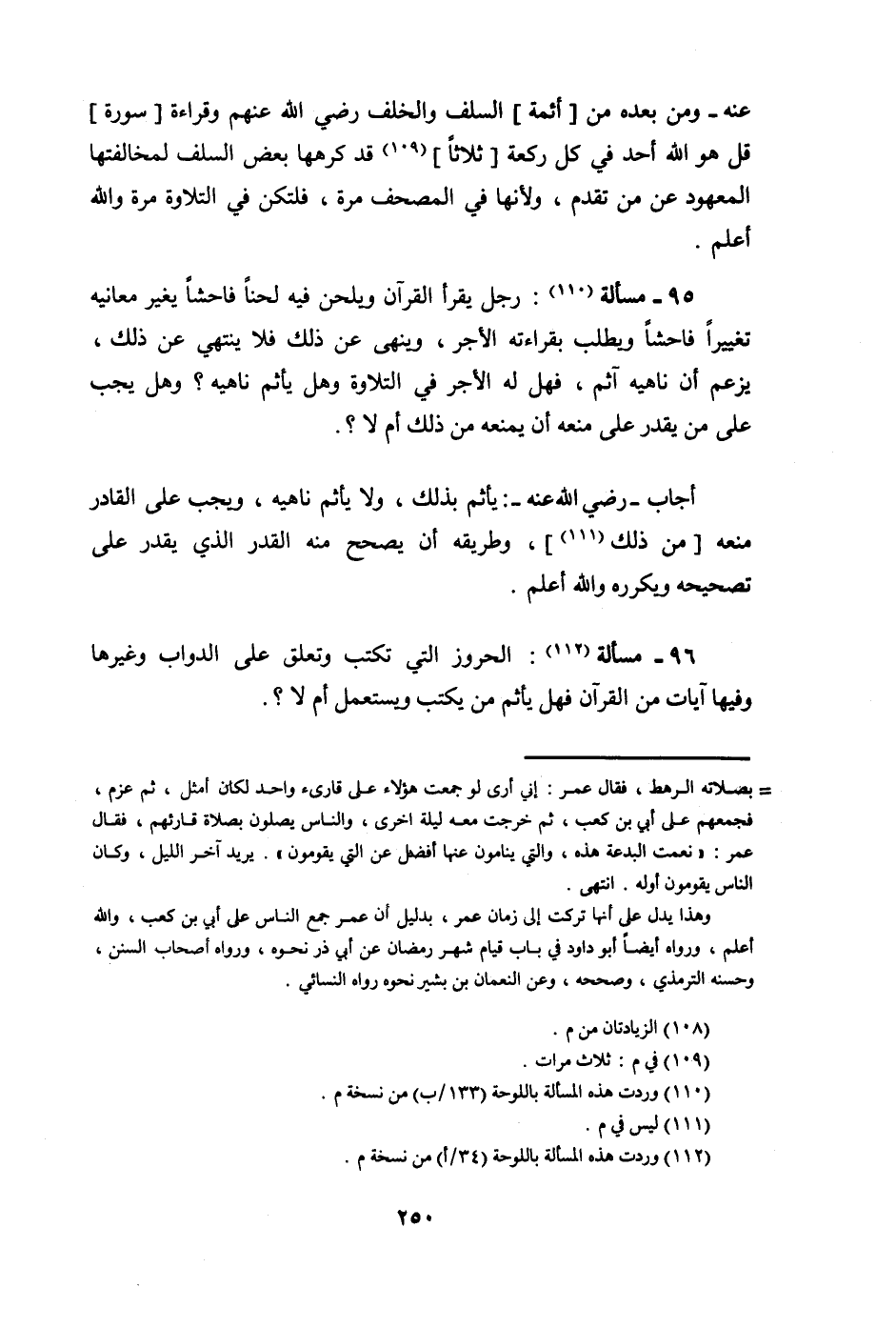 @ عَنهُ وَمن بعده من أَئِمَّة السّلف وَالْخلف رَضِي الله عَنهُ وَقِرَاءَة سُورَة قل هُوَ أحد فِي كل رَكْعَة ثَلَاثًا قد كرهها بعض السّلف لمخالفتها الْمَعْهُود عَن من تقدم وَلِأَنَّهَا فِي الْمُصحف مرّة فلتكن فِي التِّلَاوَة مرّة وَالله أعلم